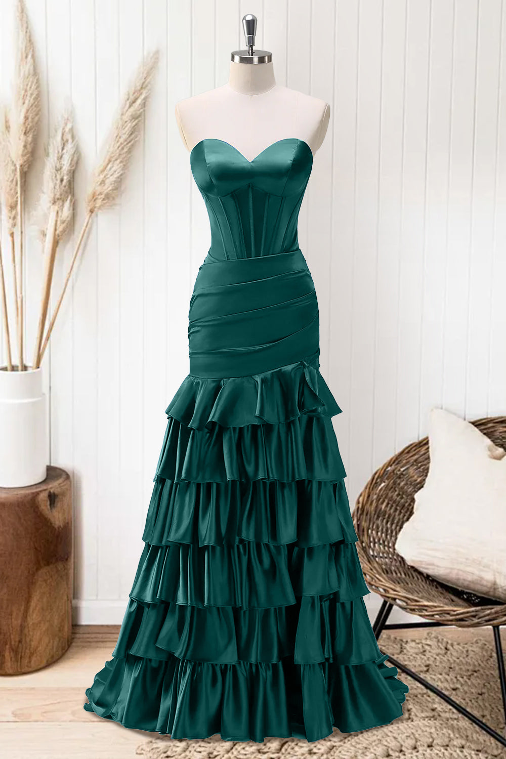 Emerald Green Mermaid Strapless Corset Tiered Prom Dress