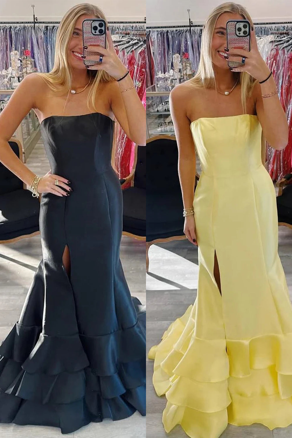 Yellow Mermaid Strapless Satin Layered Prom Dress with Slit
