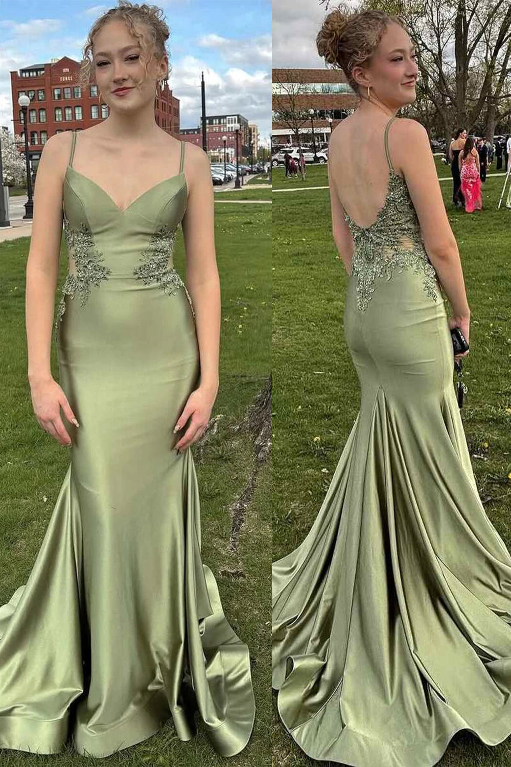 Green Mermaid Spaghetti Straps Long Prom Dress with Appliques