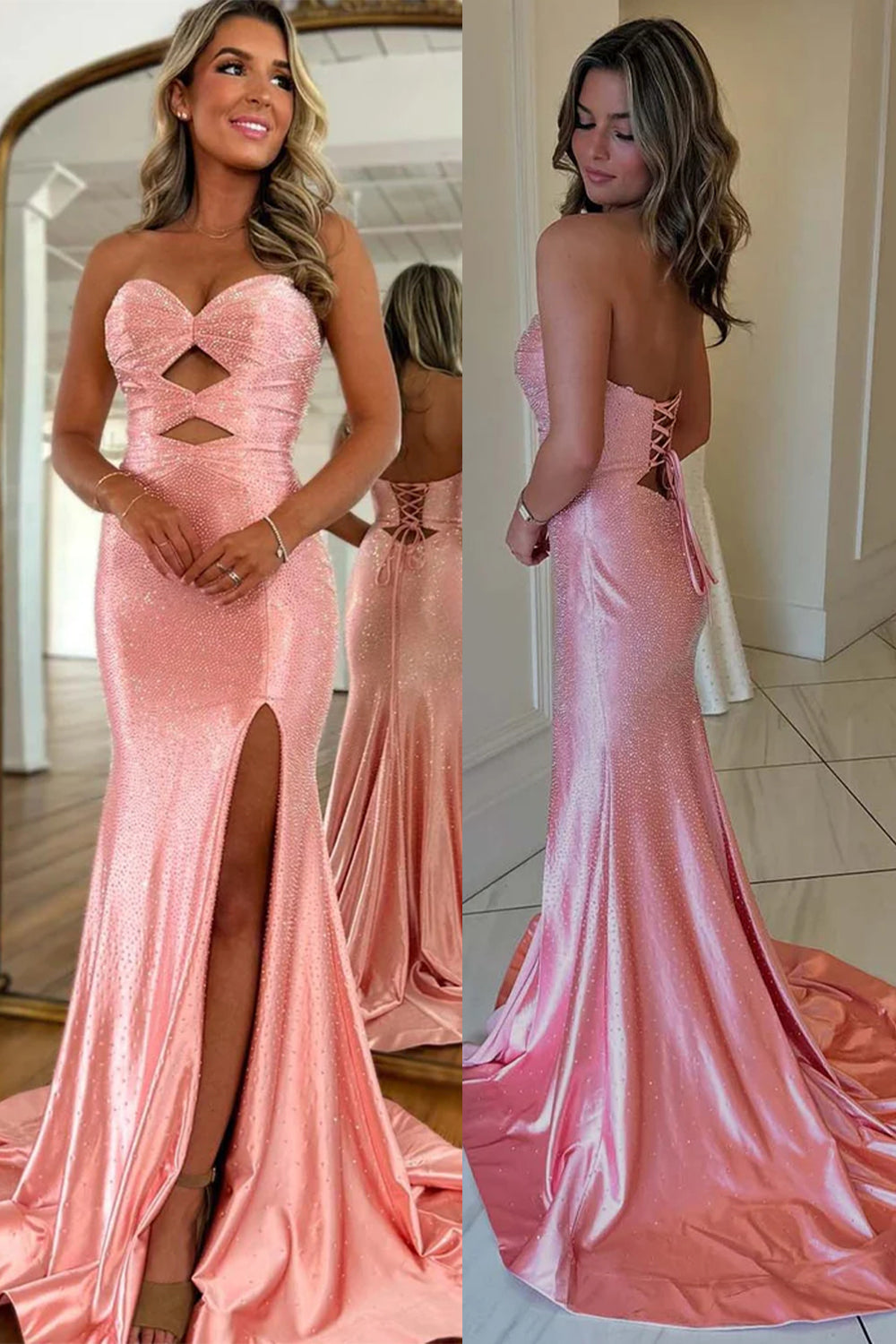 Pink Mermaid Strapless Beaded Prom Dress with Slit