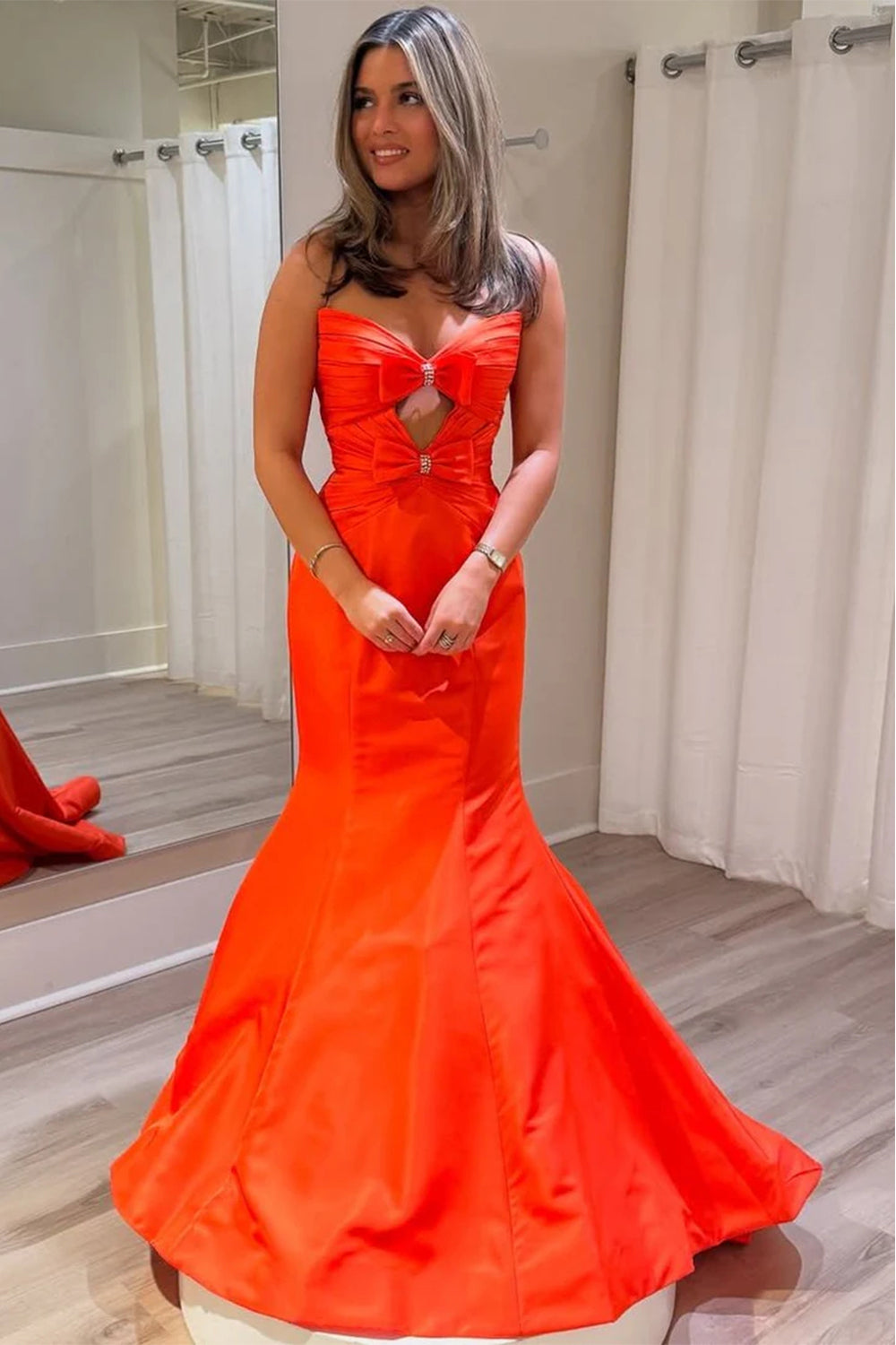 Orange Mermaid Strapless Bows Pleated Long Prom Dress