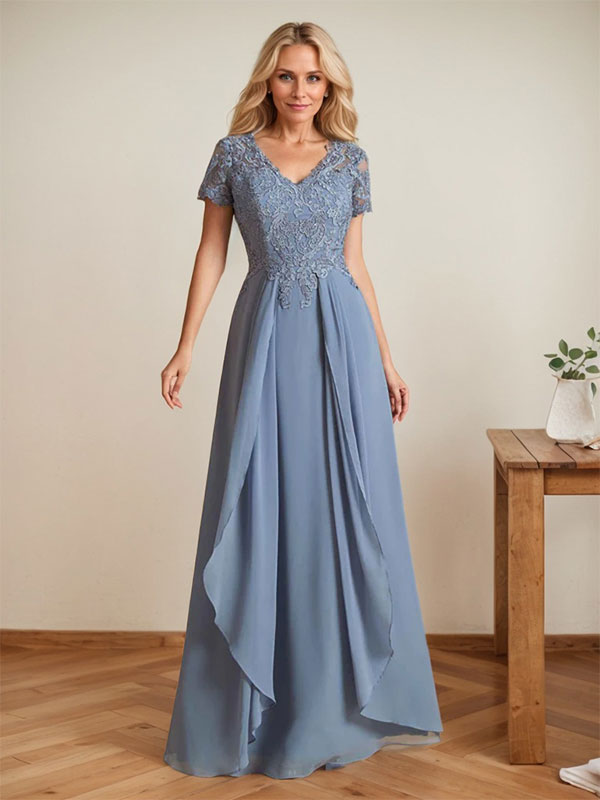 Elegant A-Line Chiffon V-neck Mother of the Brides Dresses Lace Top MOB Dresses
