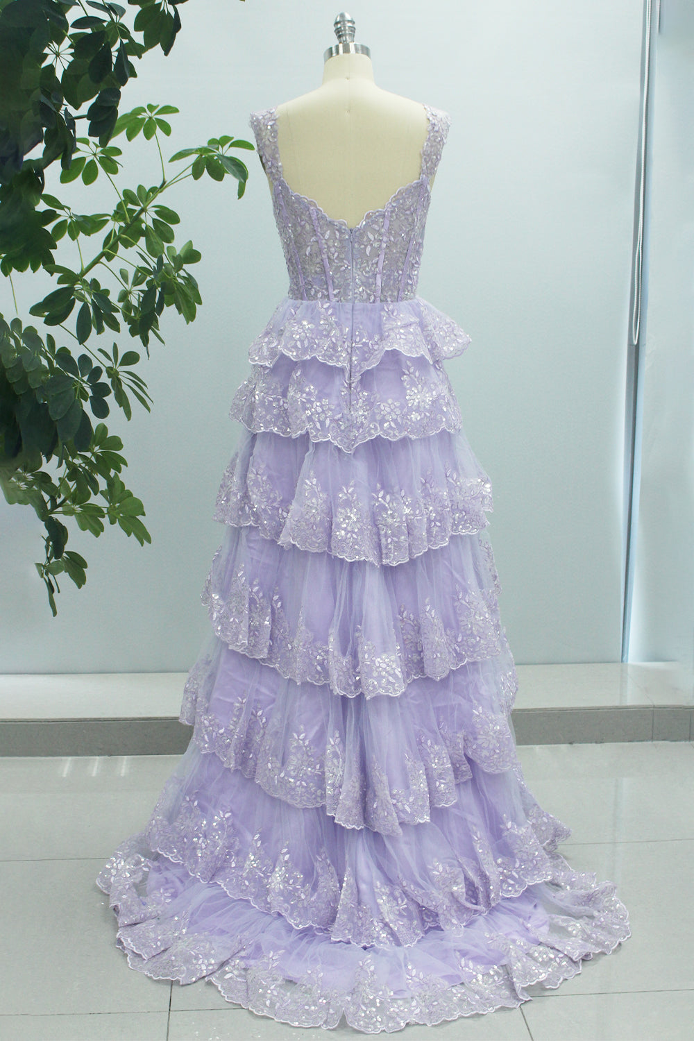 Lilac Princess A Line Sweetheart Tiered Sequin Tulle Prom Dress With Slit