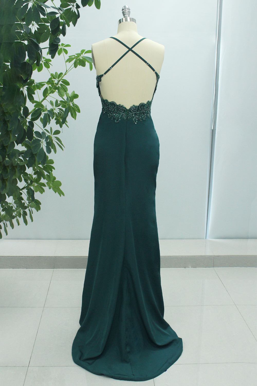 Dark Green Mermaid Spaghetti Straps Satin Long Prom Dress with Slit