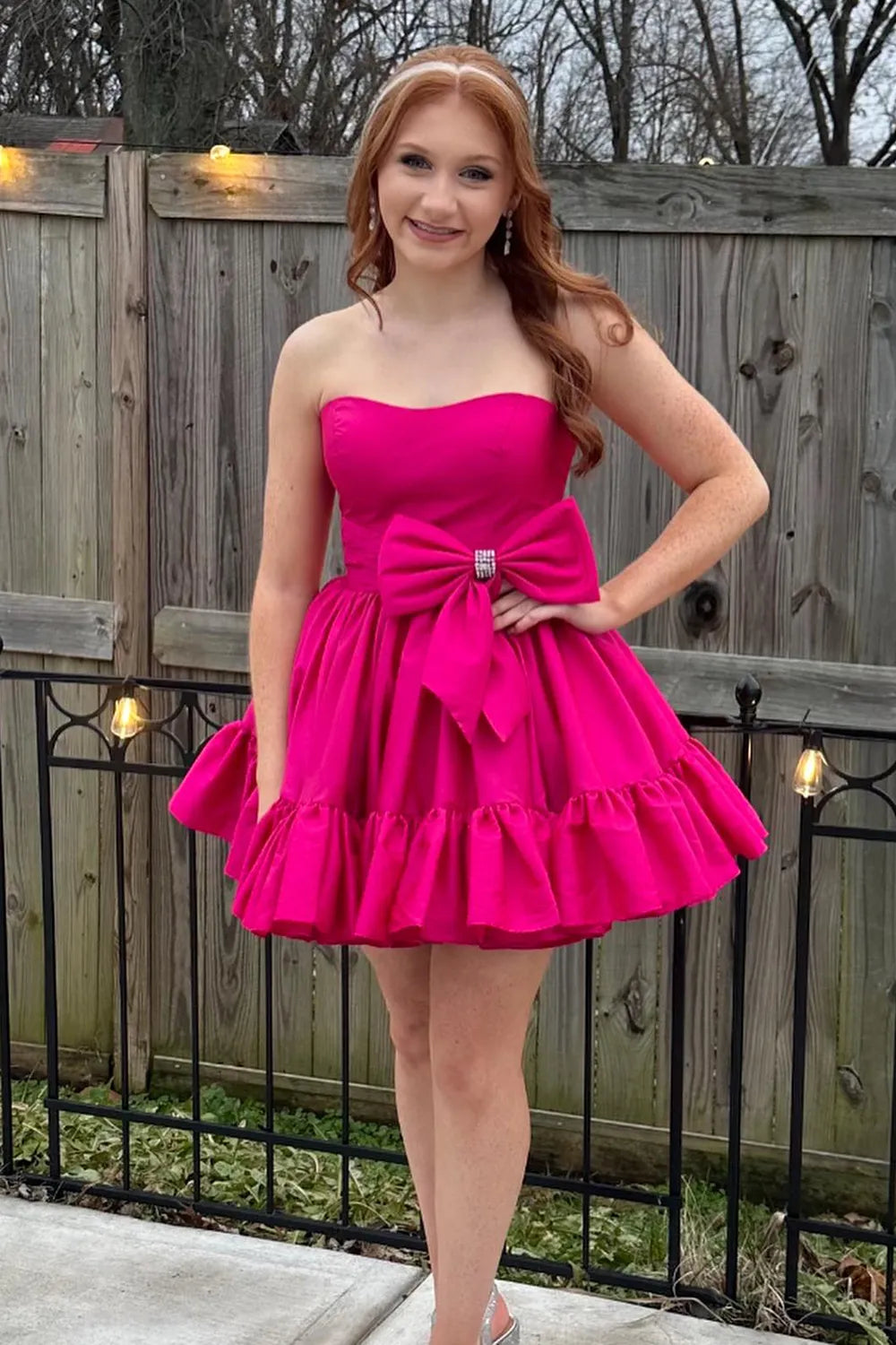 A Line Pink Strapless Tiered Short Homecoming Dress with Bow