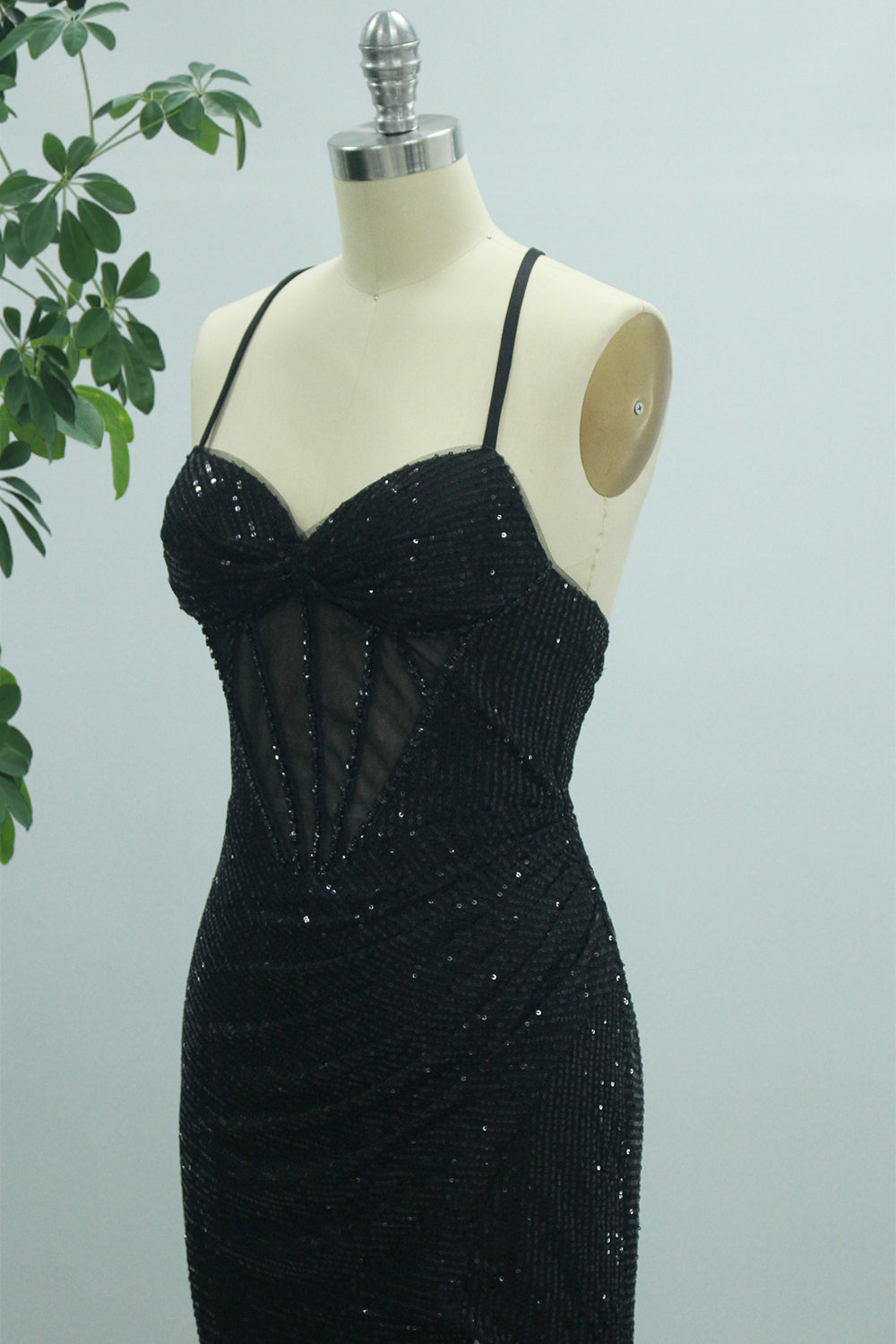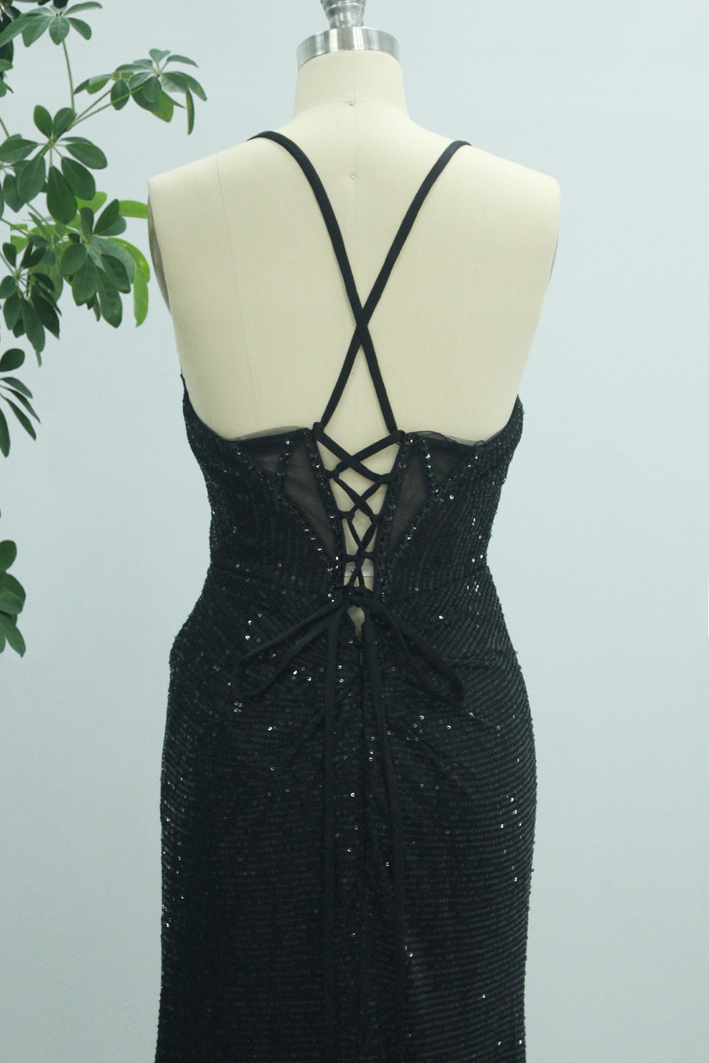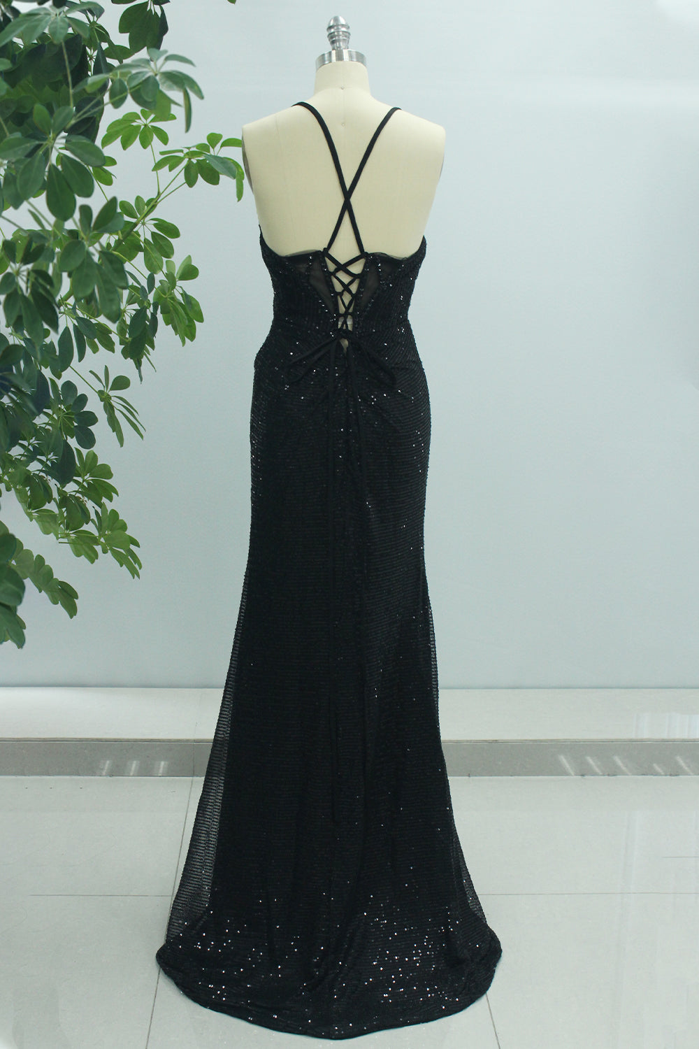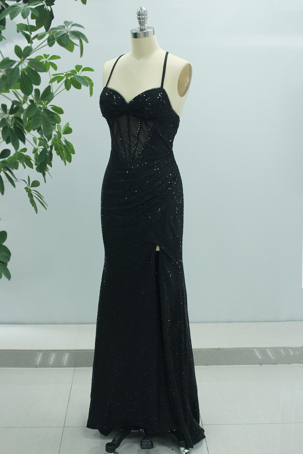 Black Mermaid Sparkly Spaghetti Straps Long Prom Dress with Slit