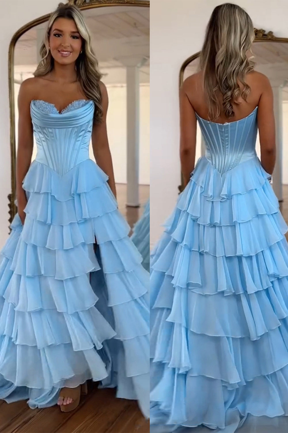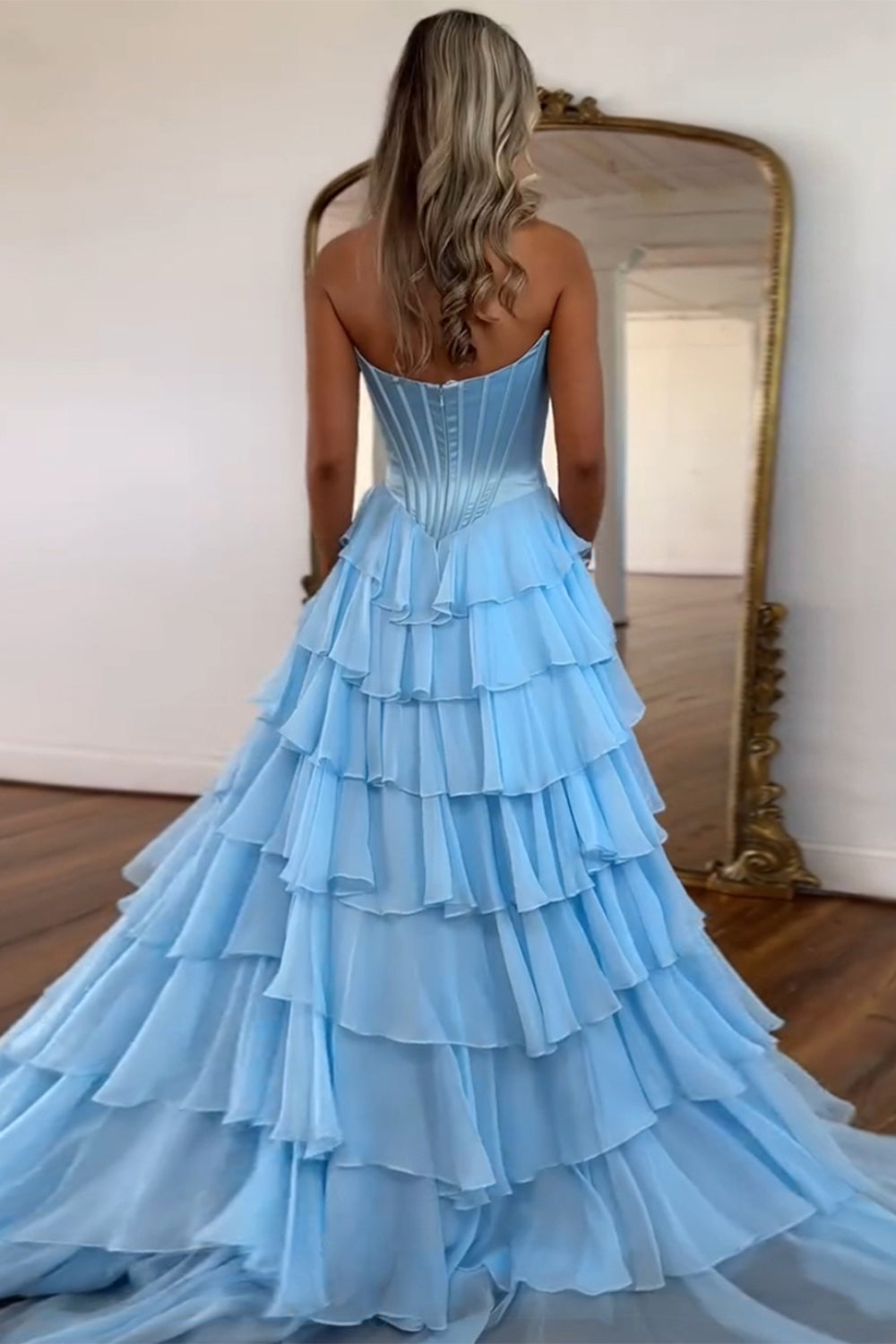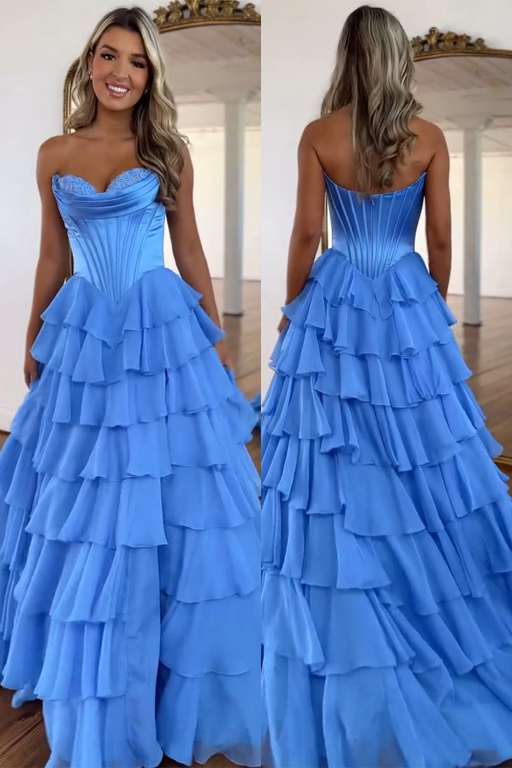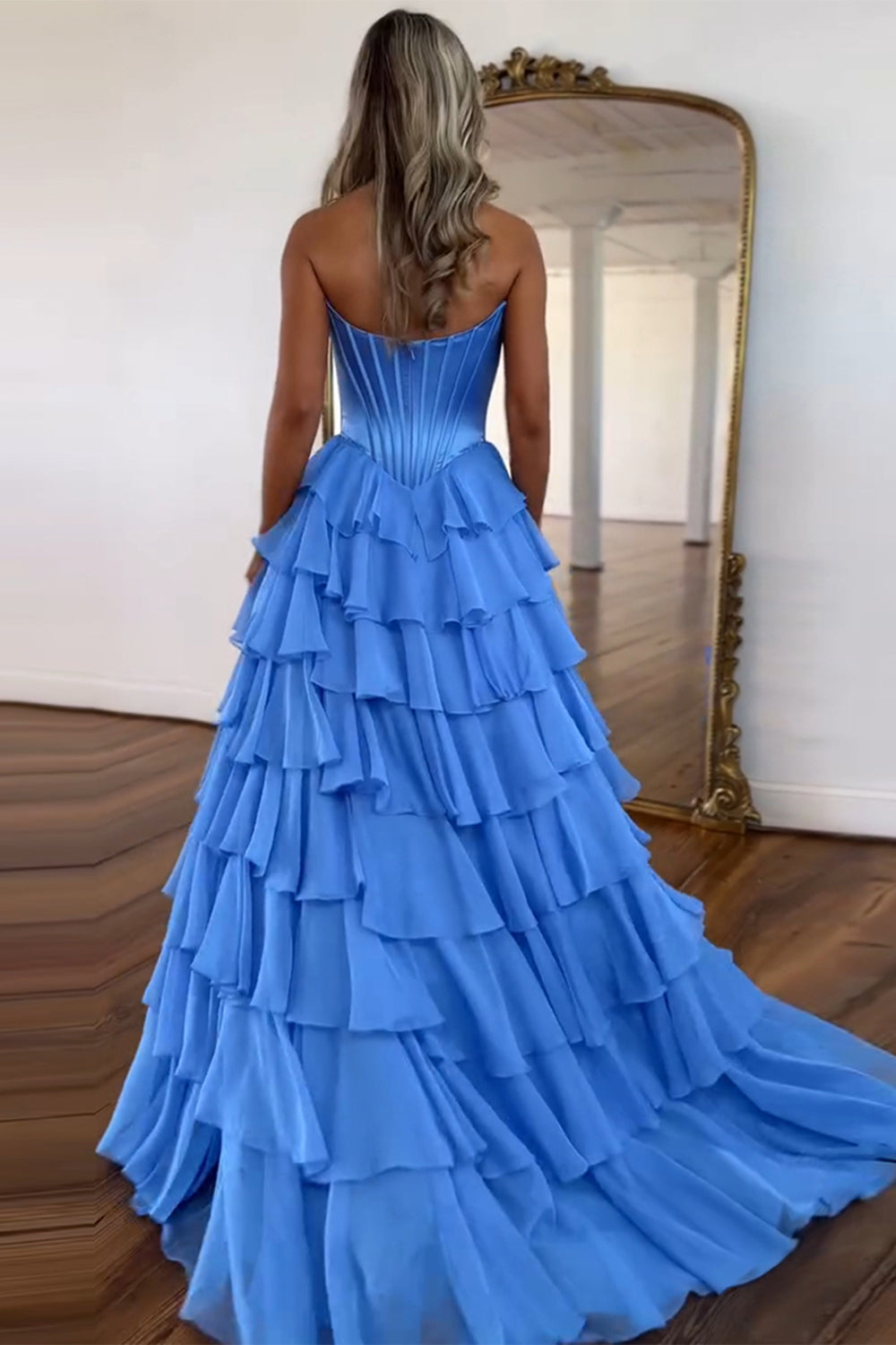 Blue A Line Strapless Satin Corset Long Prom Dress with Ruffle Skirt