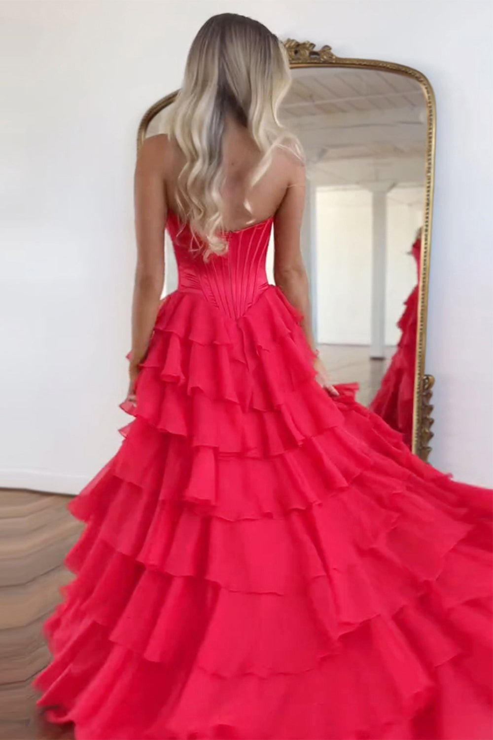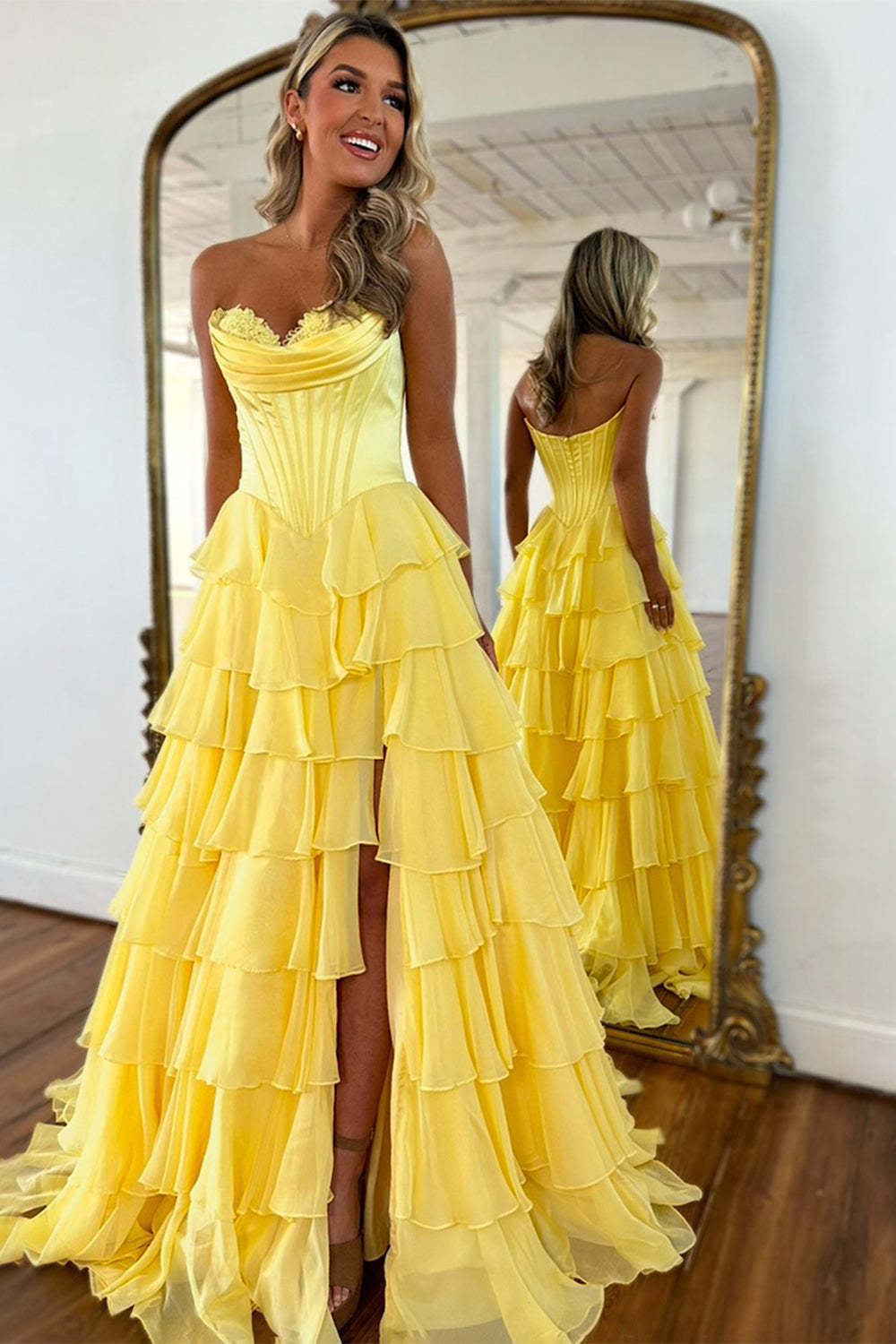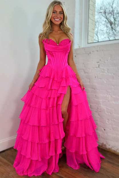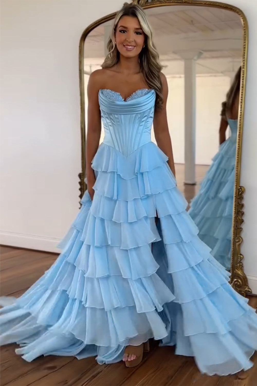 Blue A Line Strapless Satin Corset Long Prom Dress with Ruffle Skirt