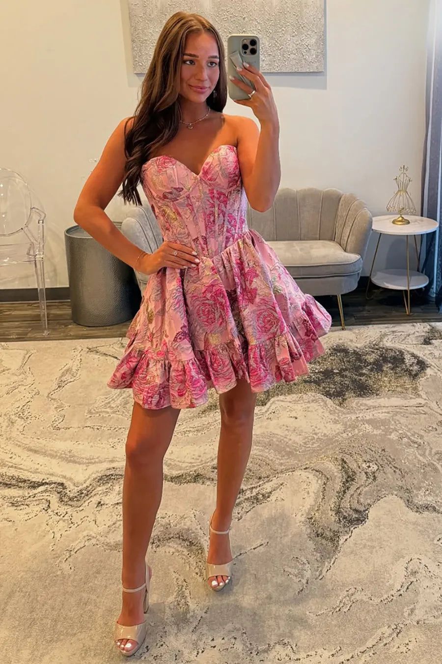Blush Floral Ruffled A Line Short Corset Homecoming Dress
