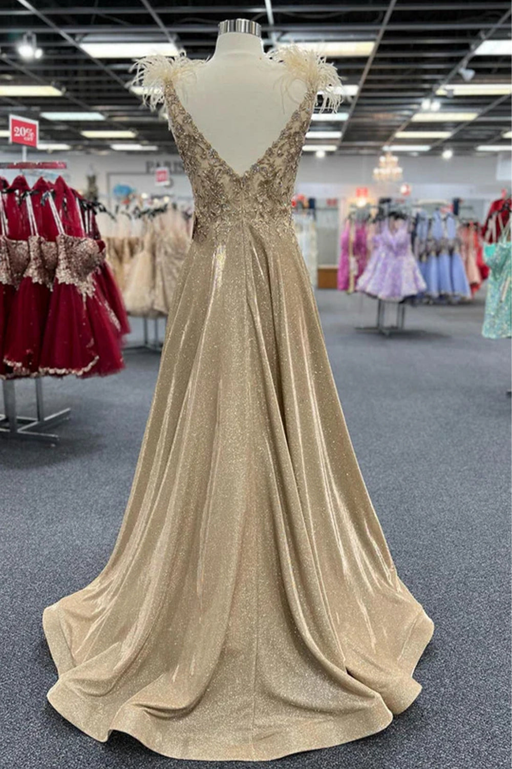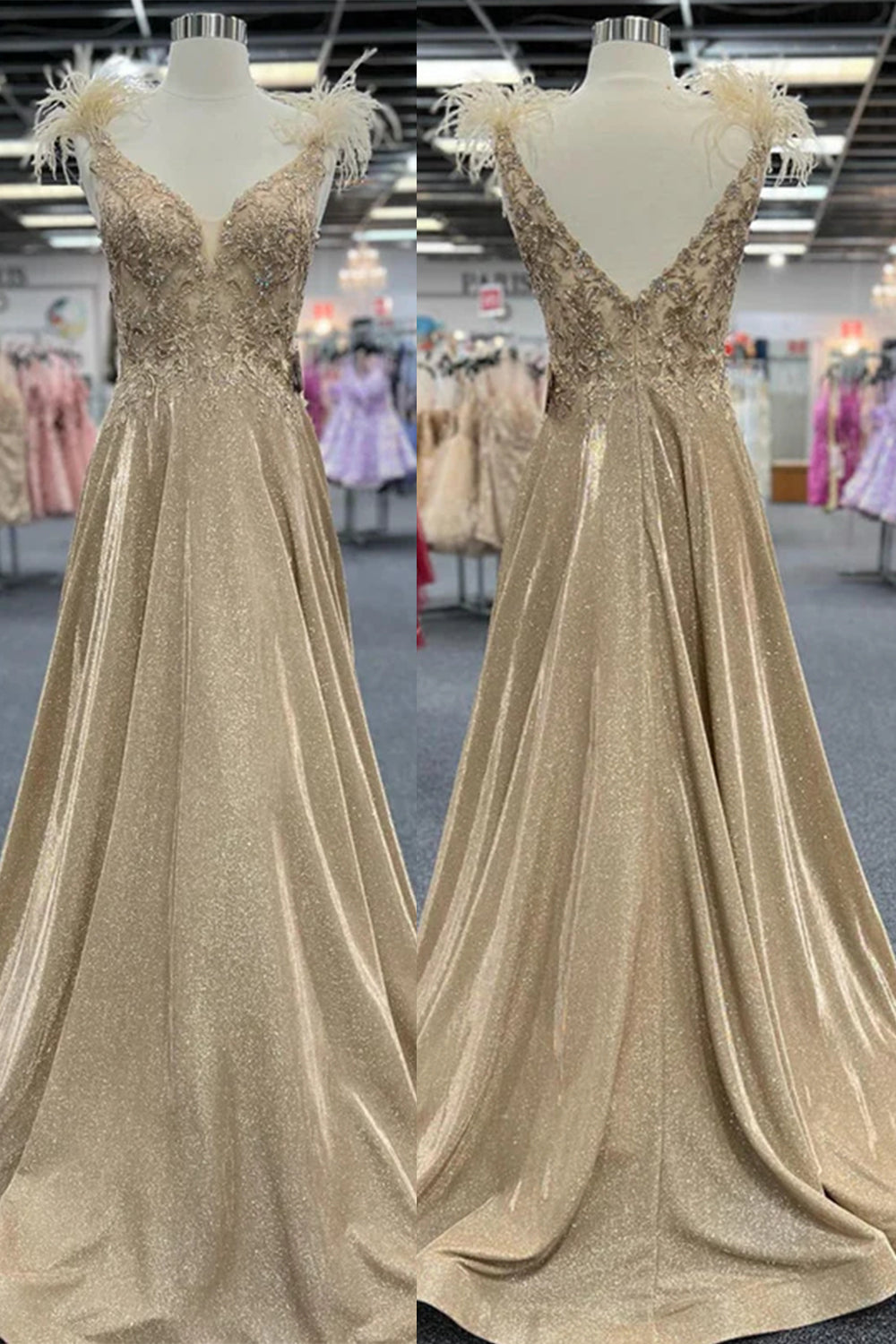 Champagne A-Line Glitter Feathers Pleated Long Prom Dress with Appliques