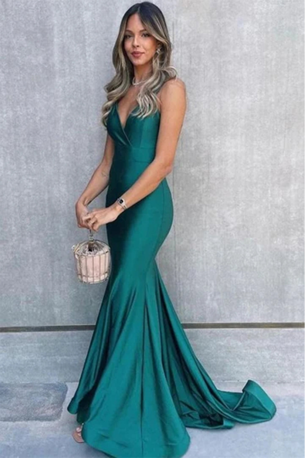 Dark Green Mermaid V-Neck Spaghetti Straps Satin Pleated Long Prom Dress