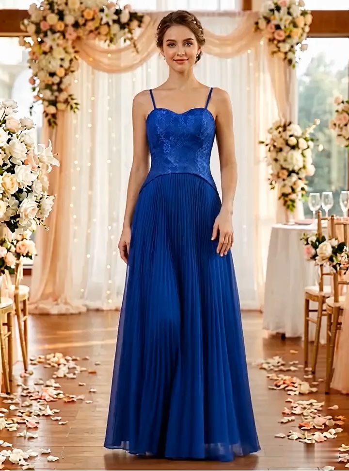 Elegant Royal Blue Lace & Pleated Chiffon Maxi Dress Gown
