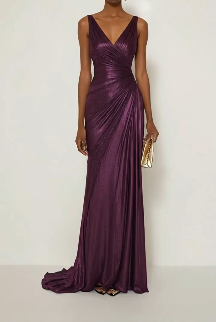 Evening Formal Dress V Neck Silk Ruffles Maxi Dress Gown