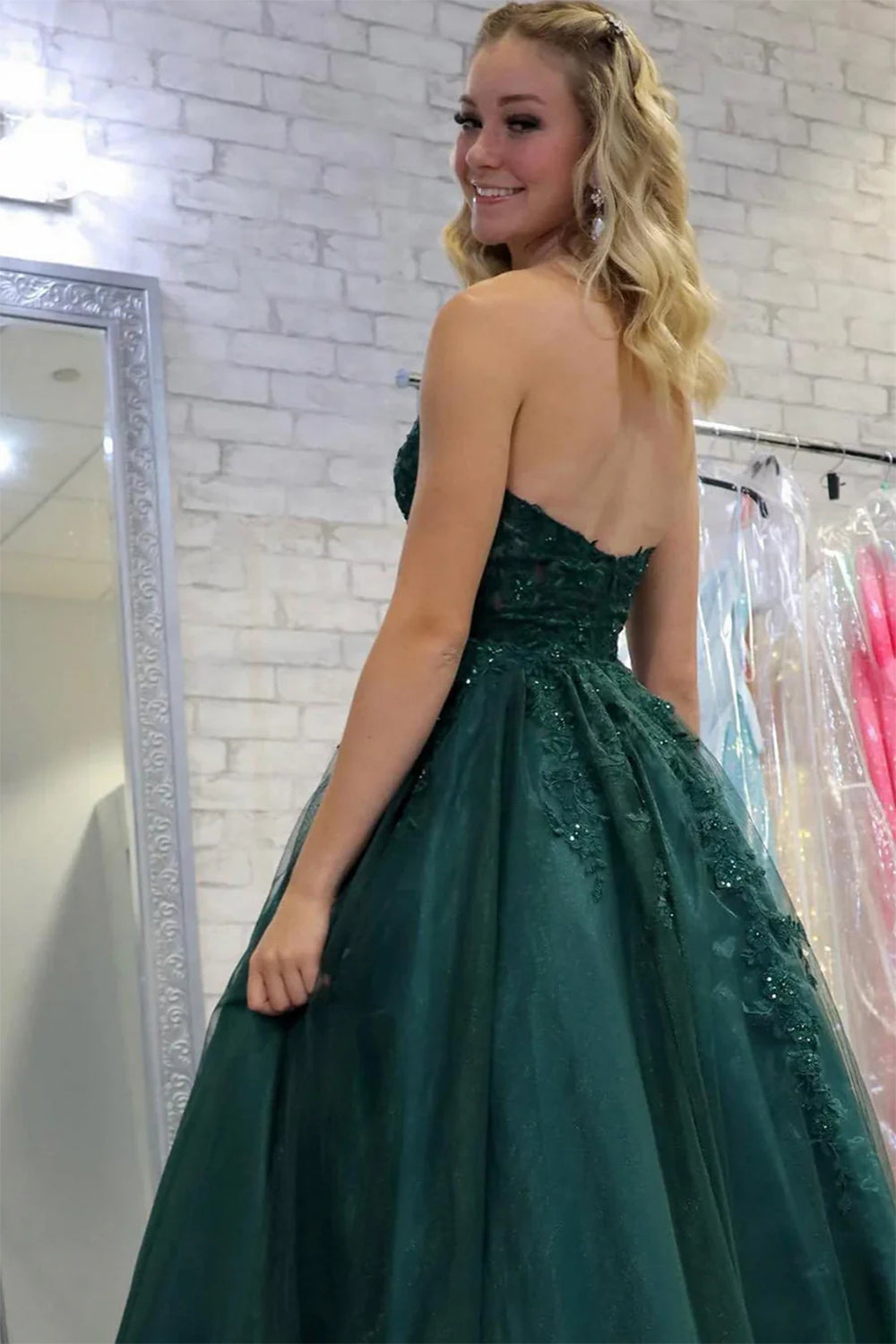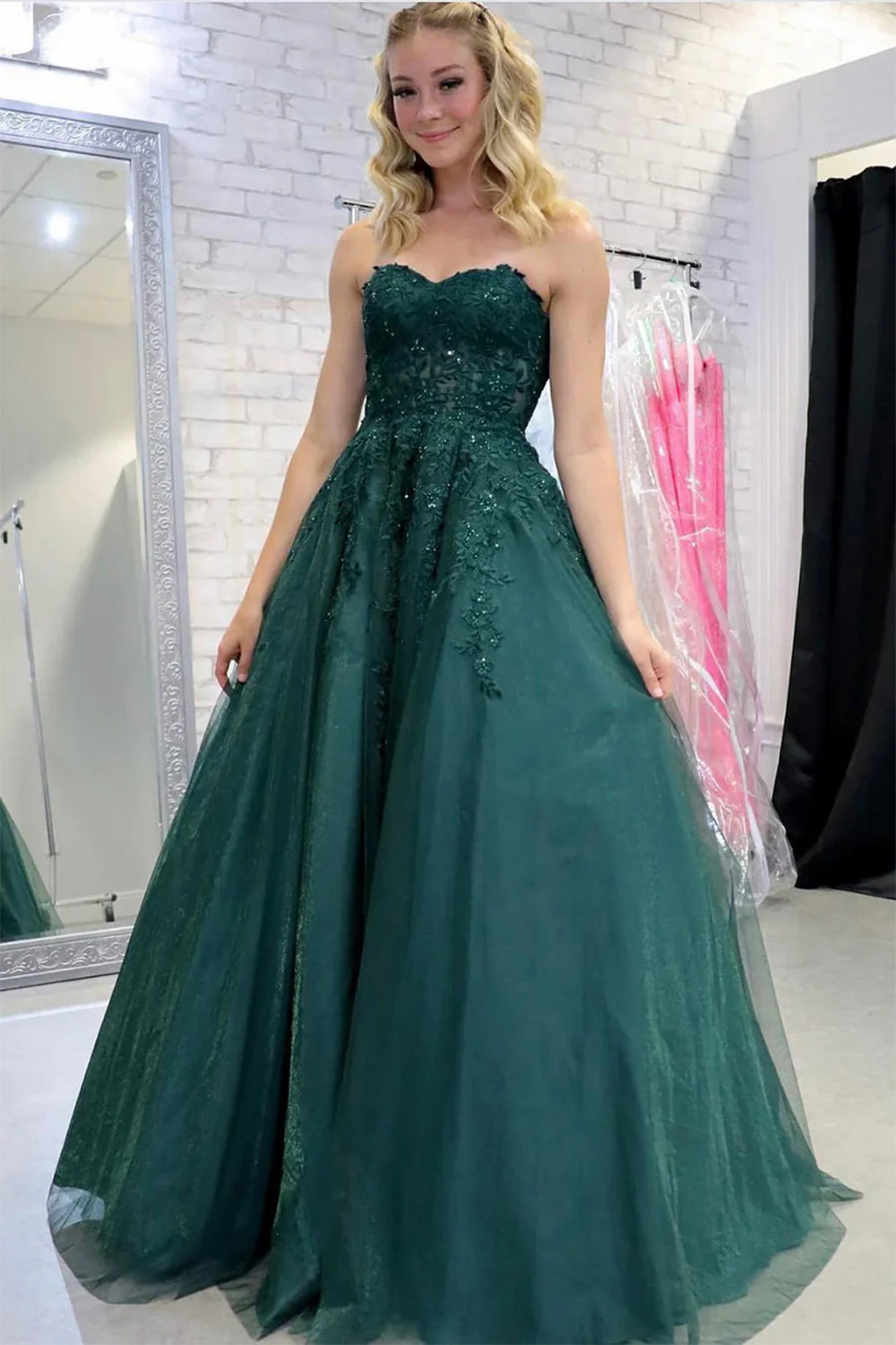 Green A Line Strapless Sweetheart Tulle Long Prom Dress with Appliques