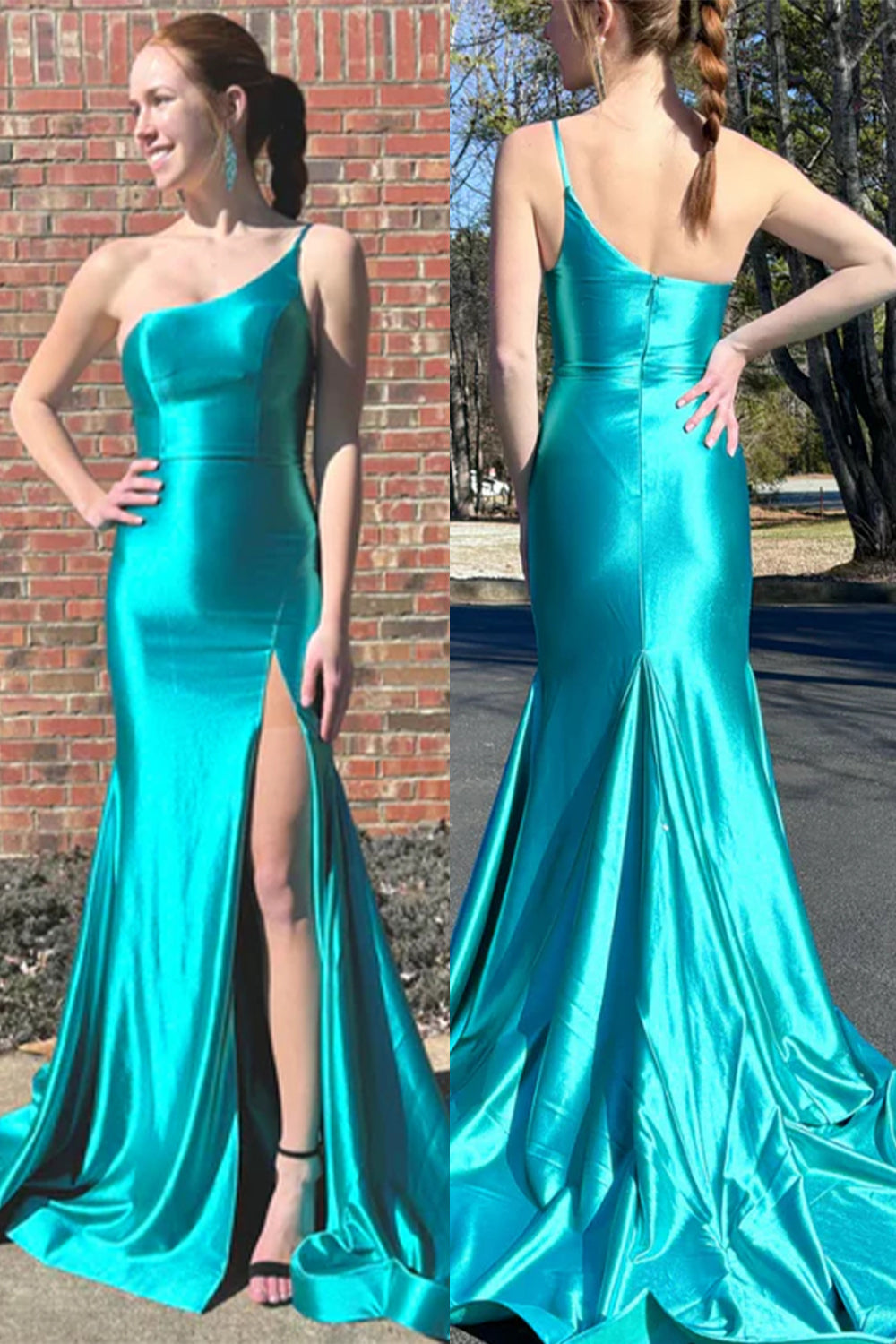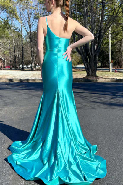 Green Mermaid One Shoulder Sleeveless Satin Pleated Long Prom Dress with Slit
