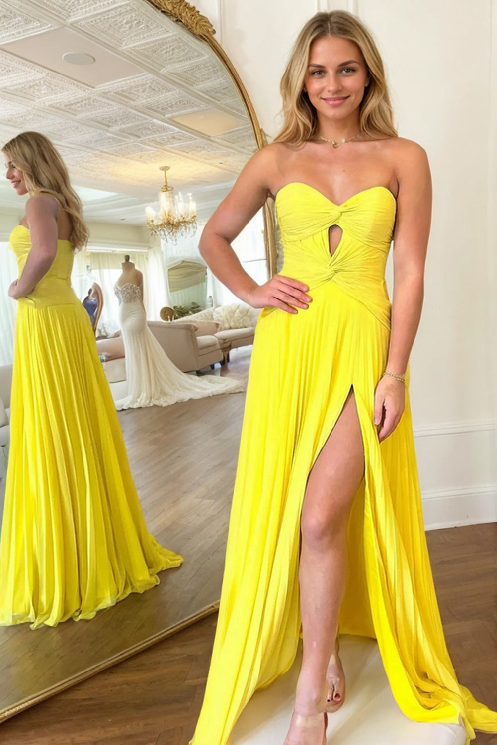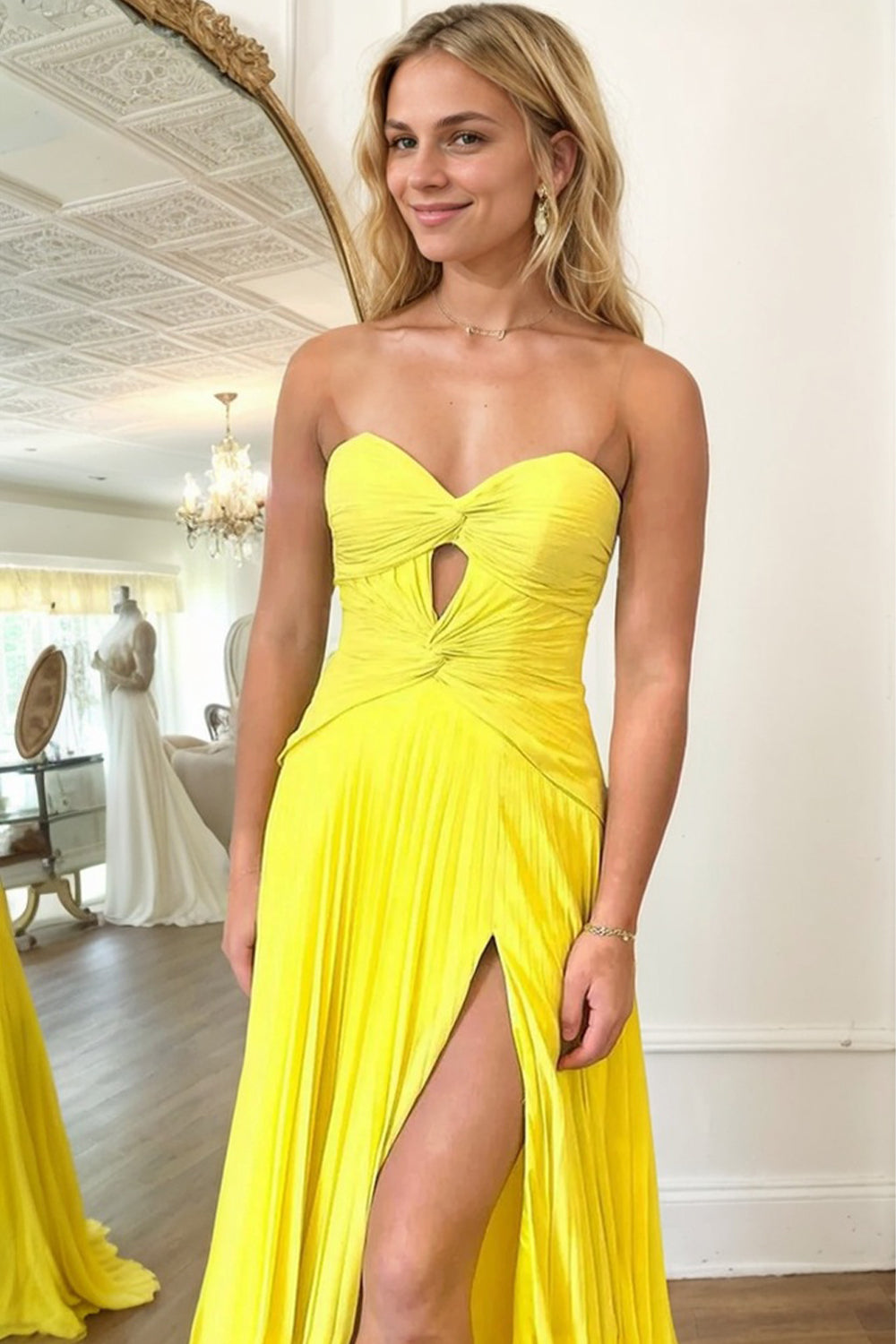 Hot Pink A-Line Strapless Keyhole Pleated Prom Dress with Slit