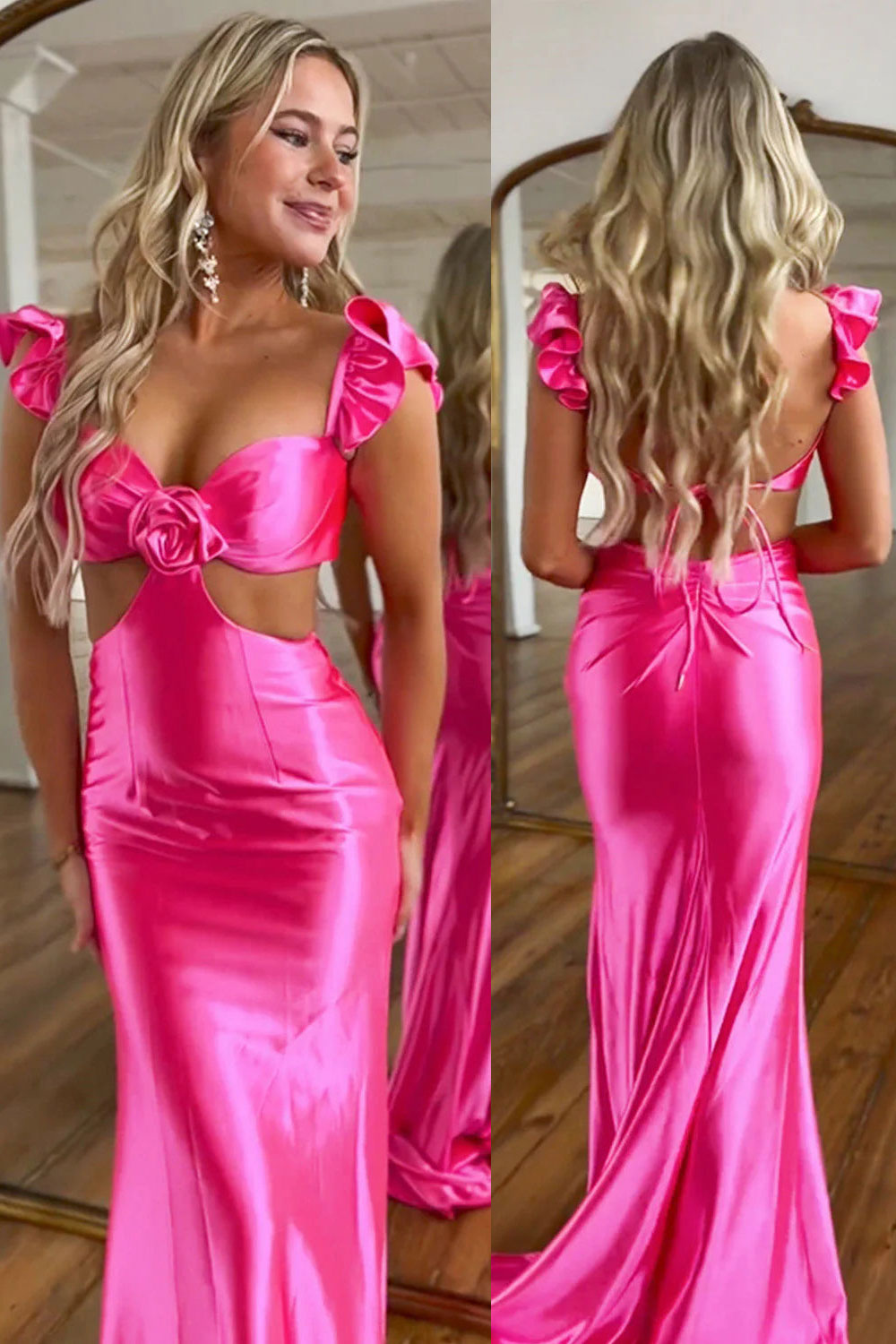 Hot Pink Mermaid Waist Hollow Long Prom Dress with Flower