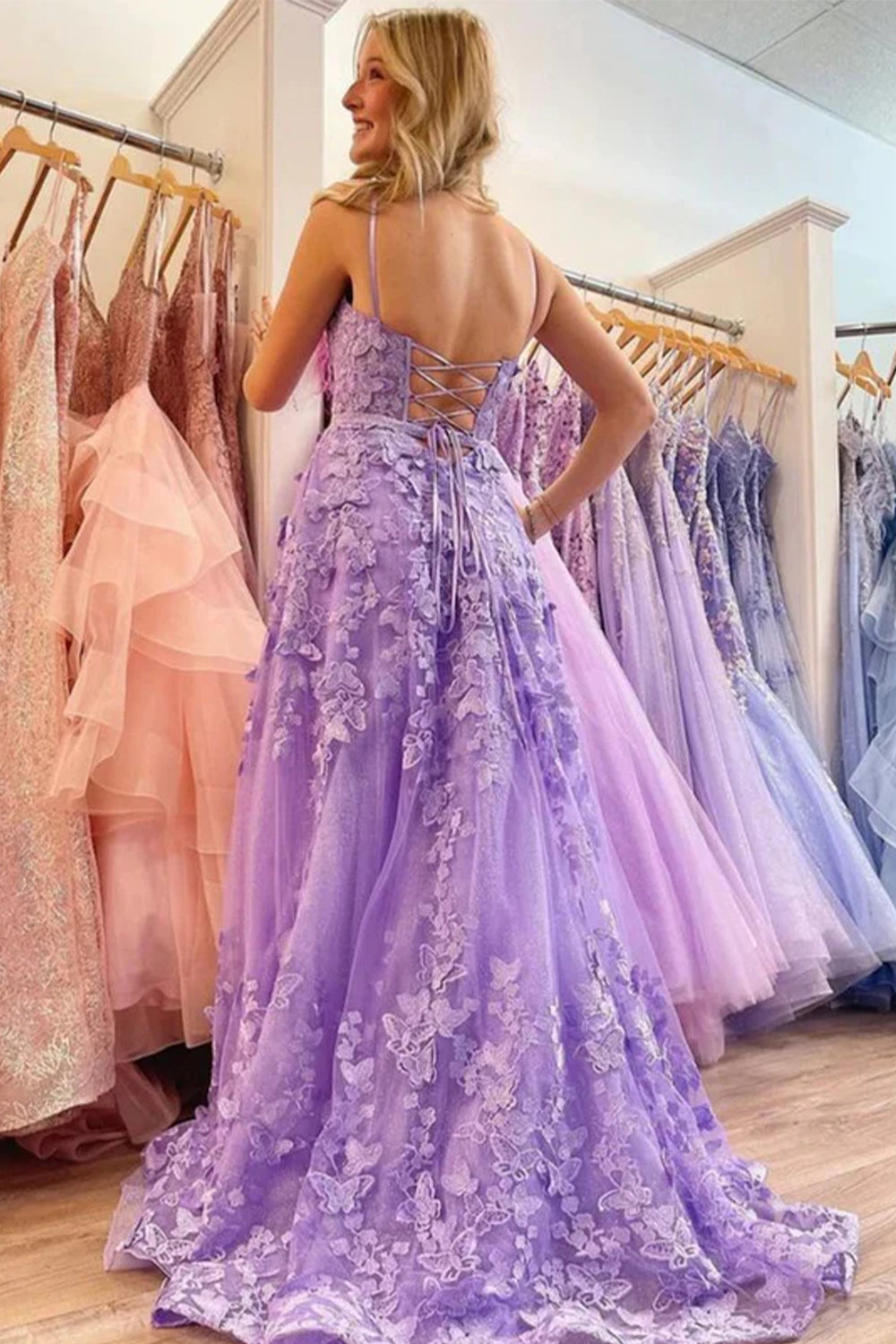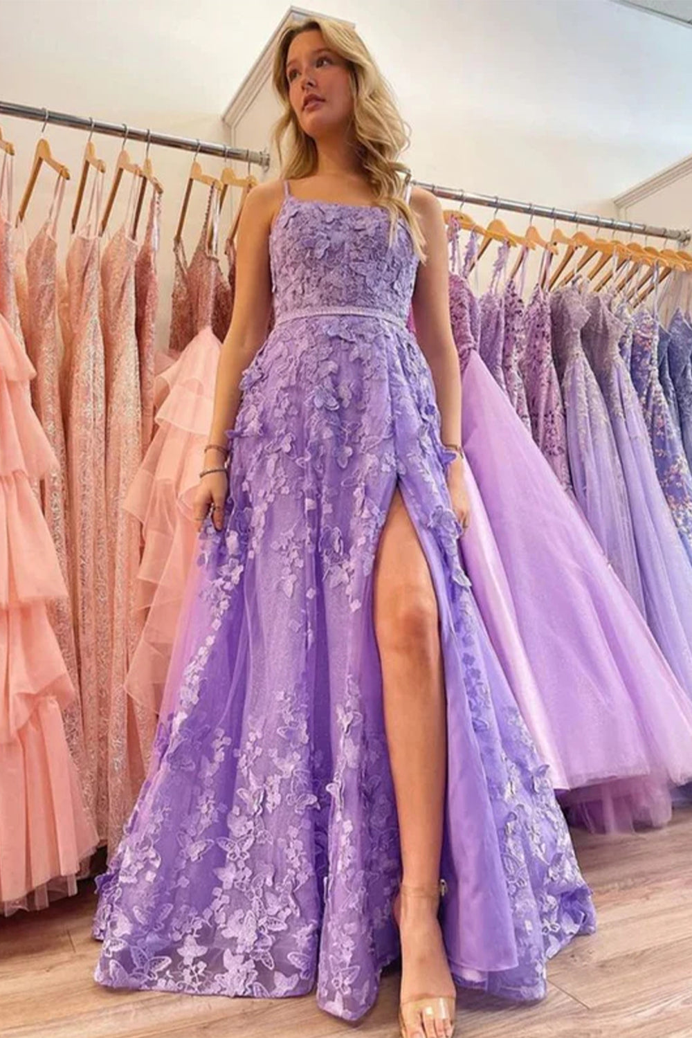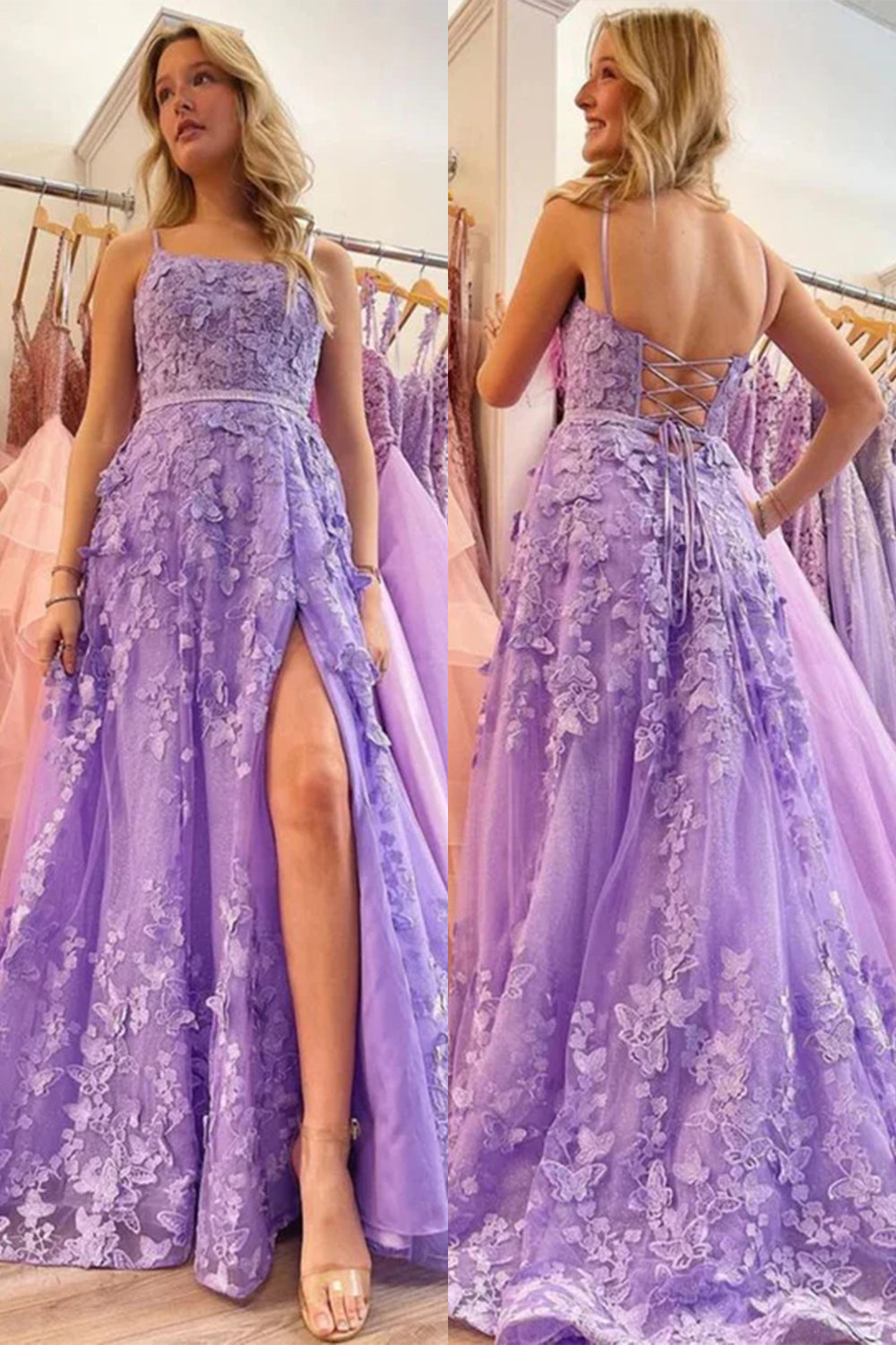 Lavender A-Line Spaghetti Straps Lace Appliques Prom Dress with Slit