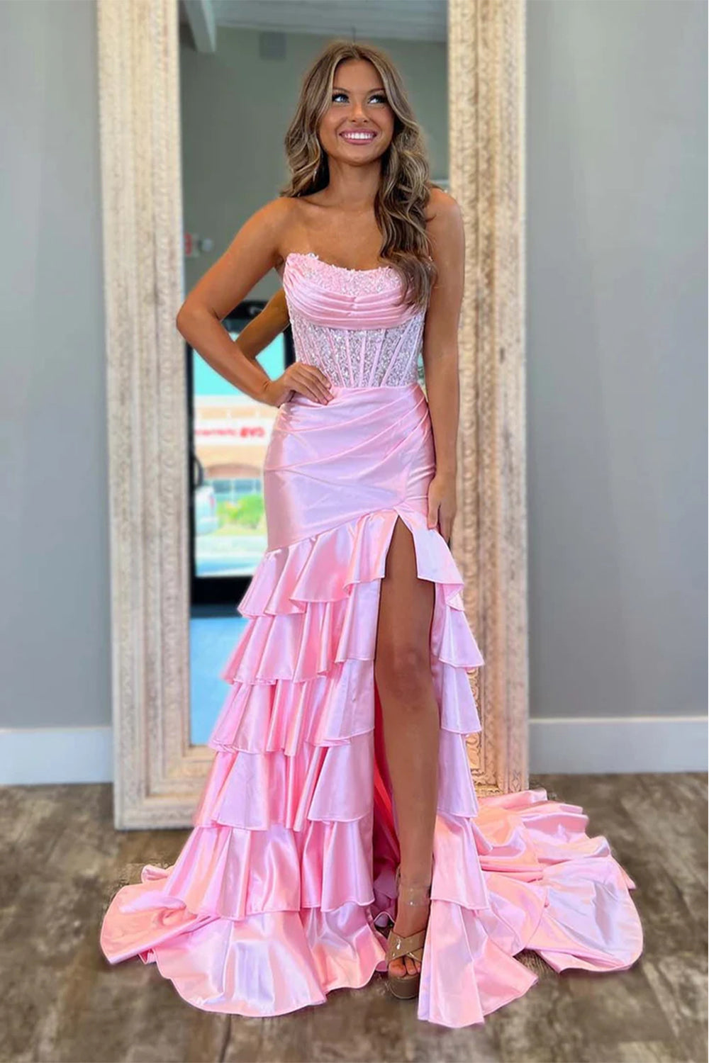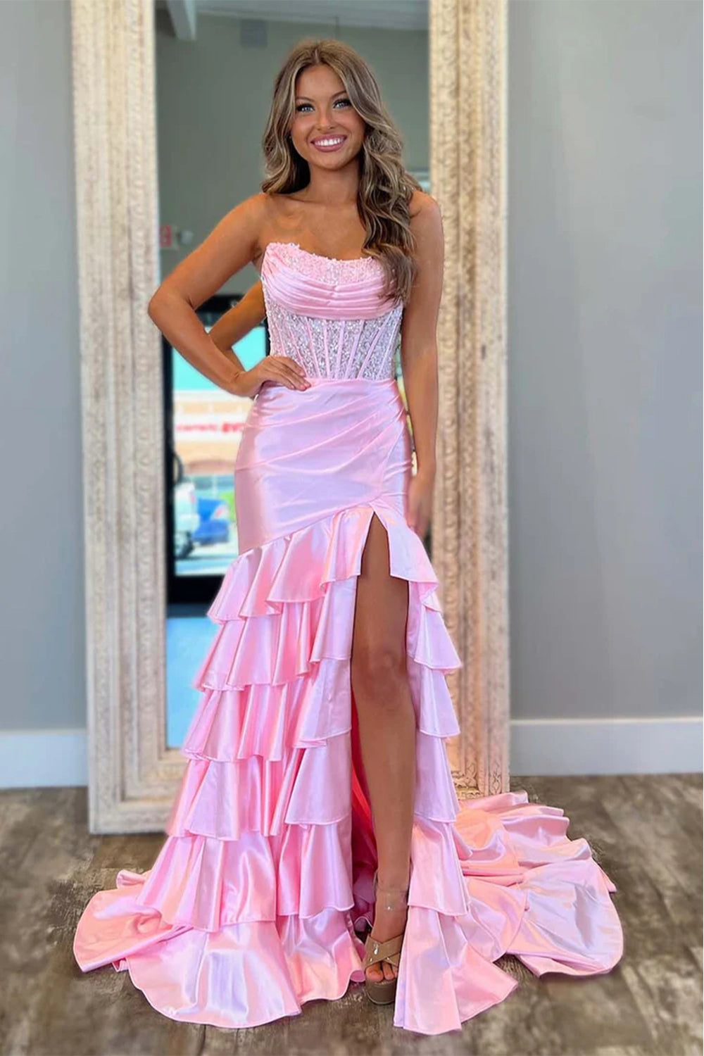 Light Pink Mermaid Strapless Corset Long Prom Dress with Ruffle Skirt