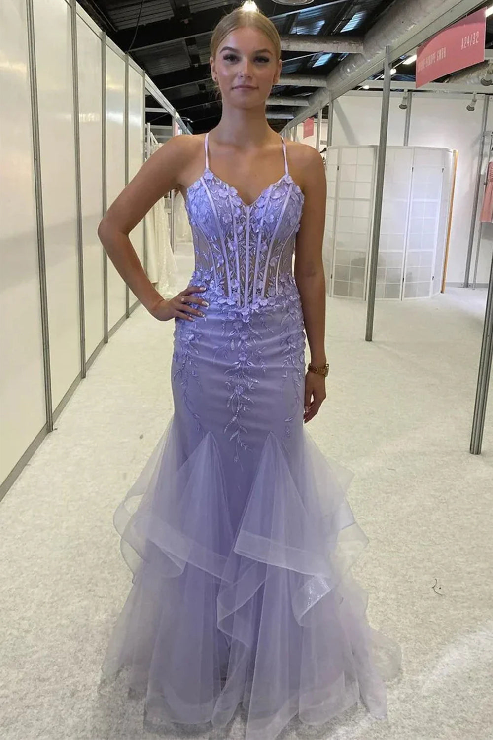 Lilac Mermaid Spaghetti Straps Ruffles Long Prom Dress with Appliques