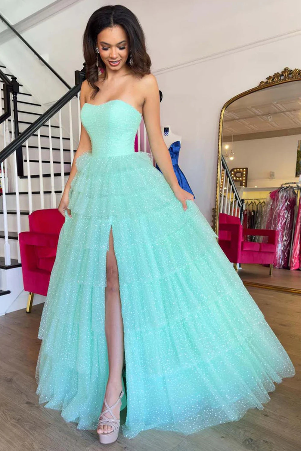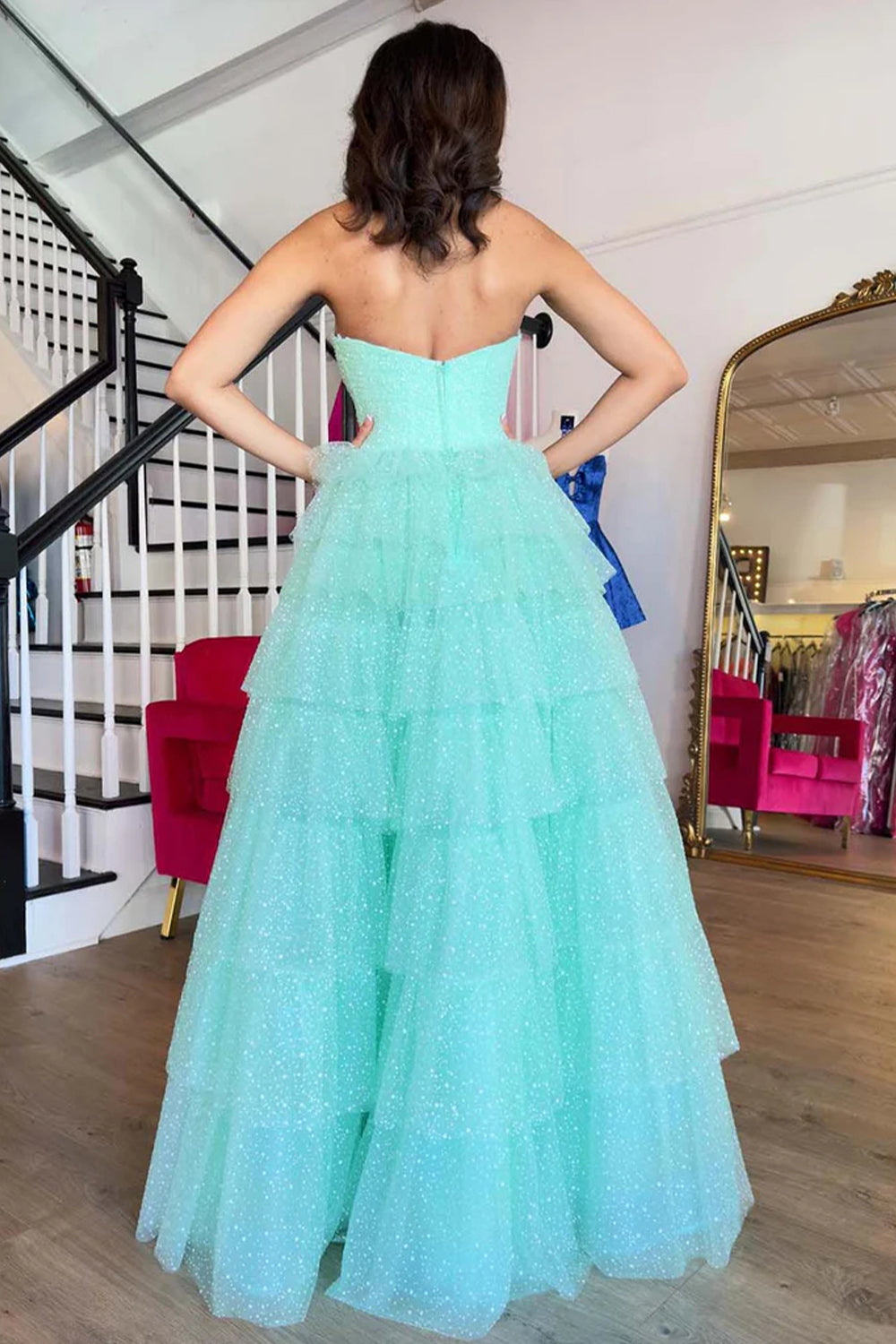 Mint Green A Line Straplesss Tulle Tiered Prom Dress
