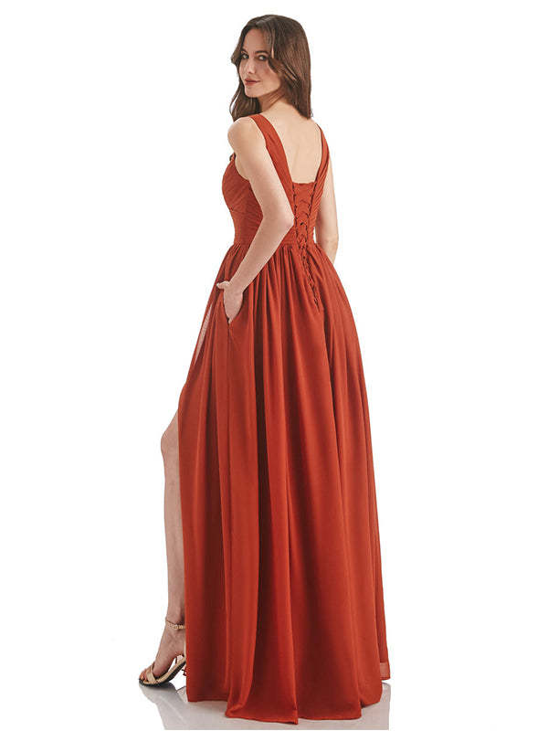 Orange A-Line V-Neck Long Bridesmaid Dress With Slit