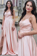 Pink A-Line Spaghetti Straps Pleated Long Prom Dress with Slit