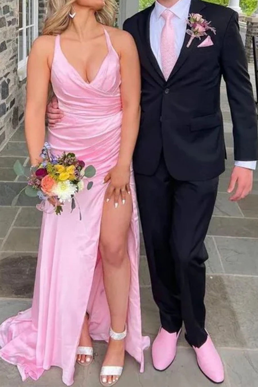 Pink A Line V-Neck Pleated Long Prom Dress with Side Slit
