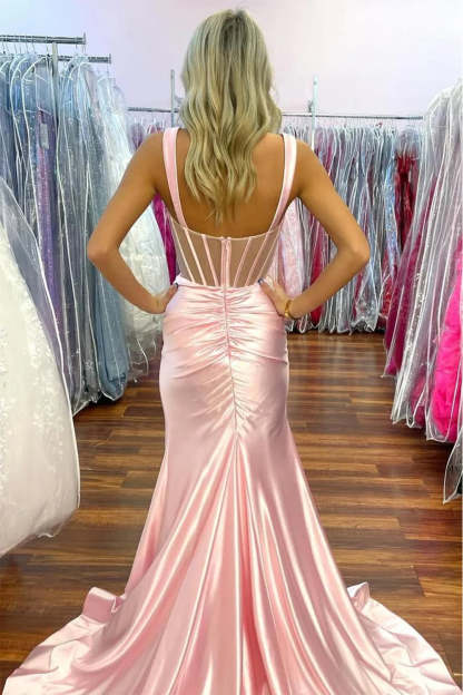 Pink Mermaid Square Neck Pleated Long Prom Dress with Slit
