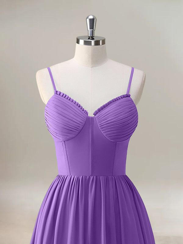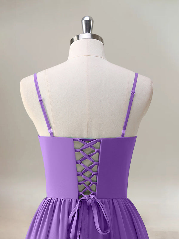 Purple A-Line Spaghetti Straps Corset Ruffled Long Bridesmaid Dress with Slit