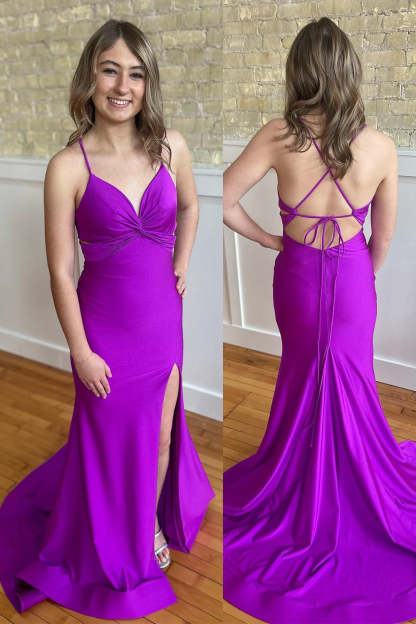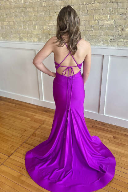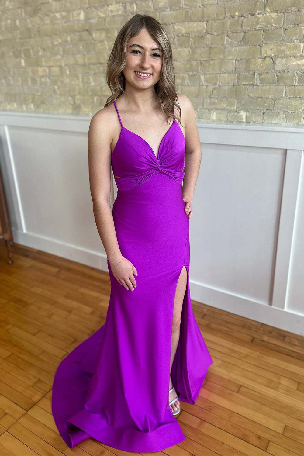 Purple Mermaid V Neck Spaghetti Strap Ruched Long Prom Dress