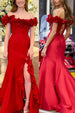 Red A-Line Off The Shoulder Ruched Ruffles Prom Dress with Slit