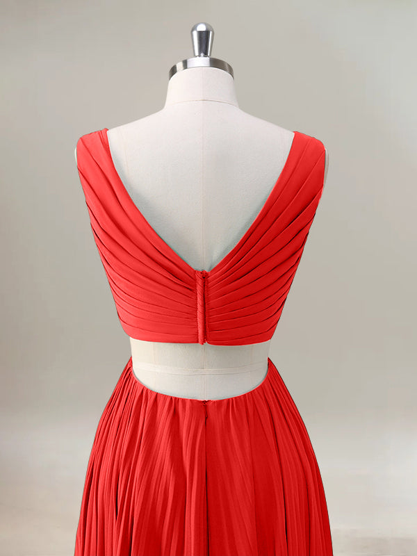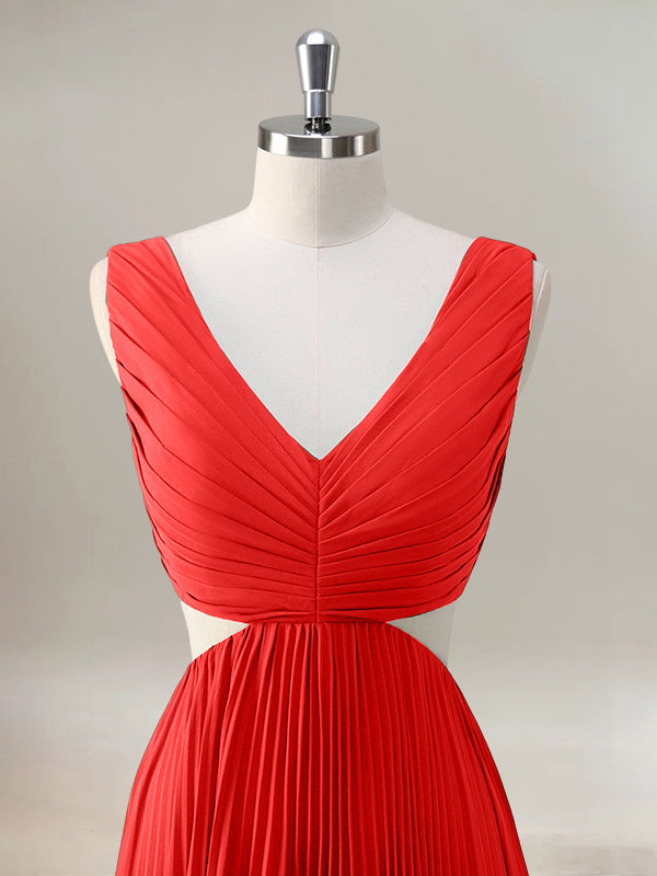 Red A-Line V Neck Pleated Chiffon Hollow Out Knee Length Bridesmaid Dress