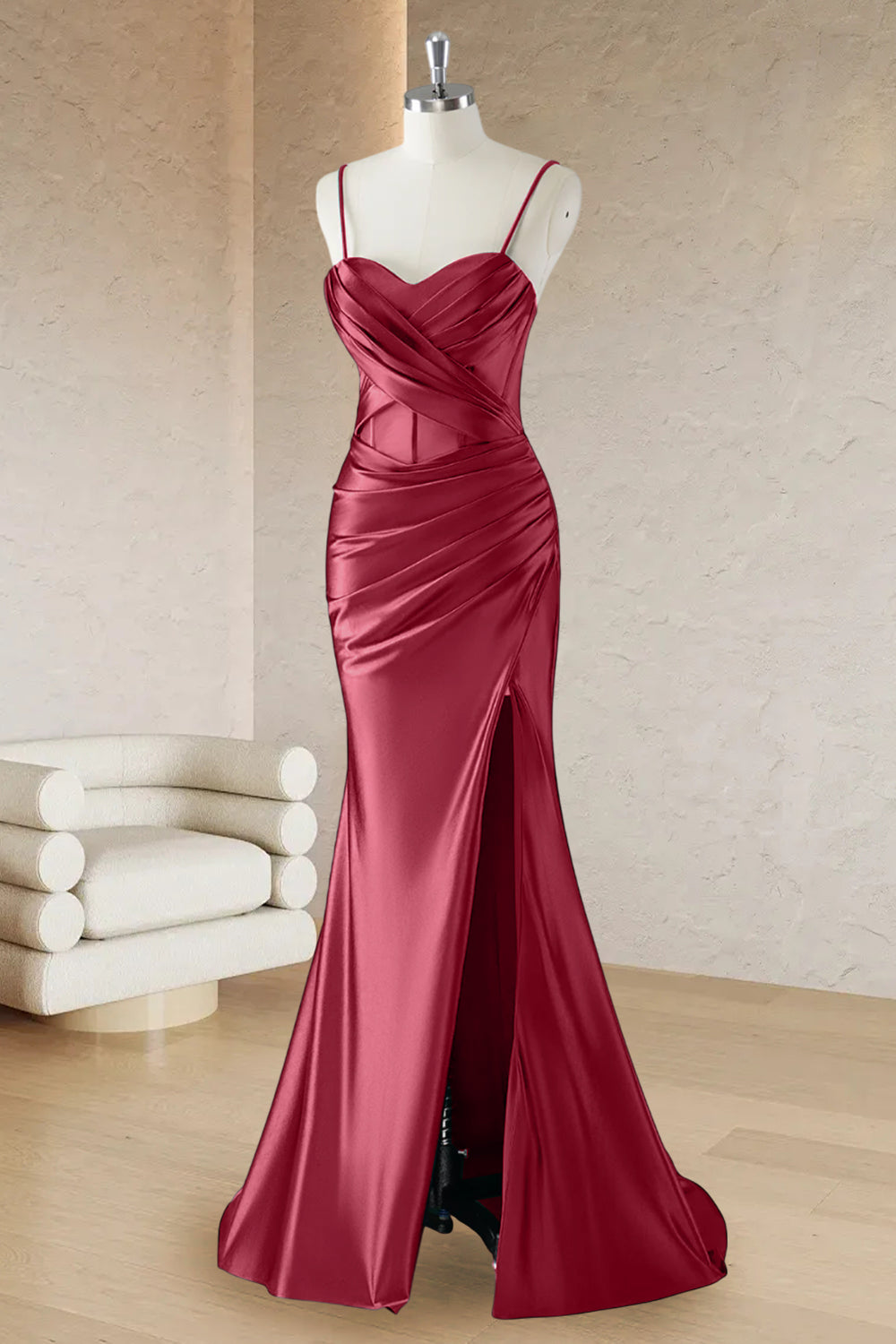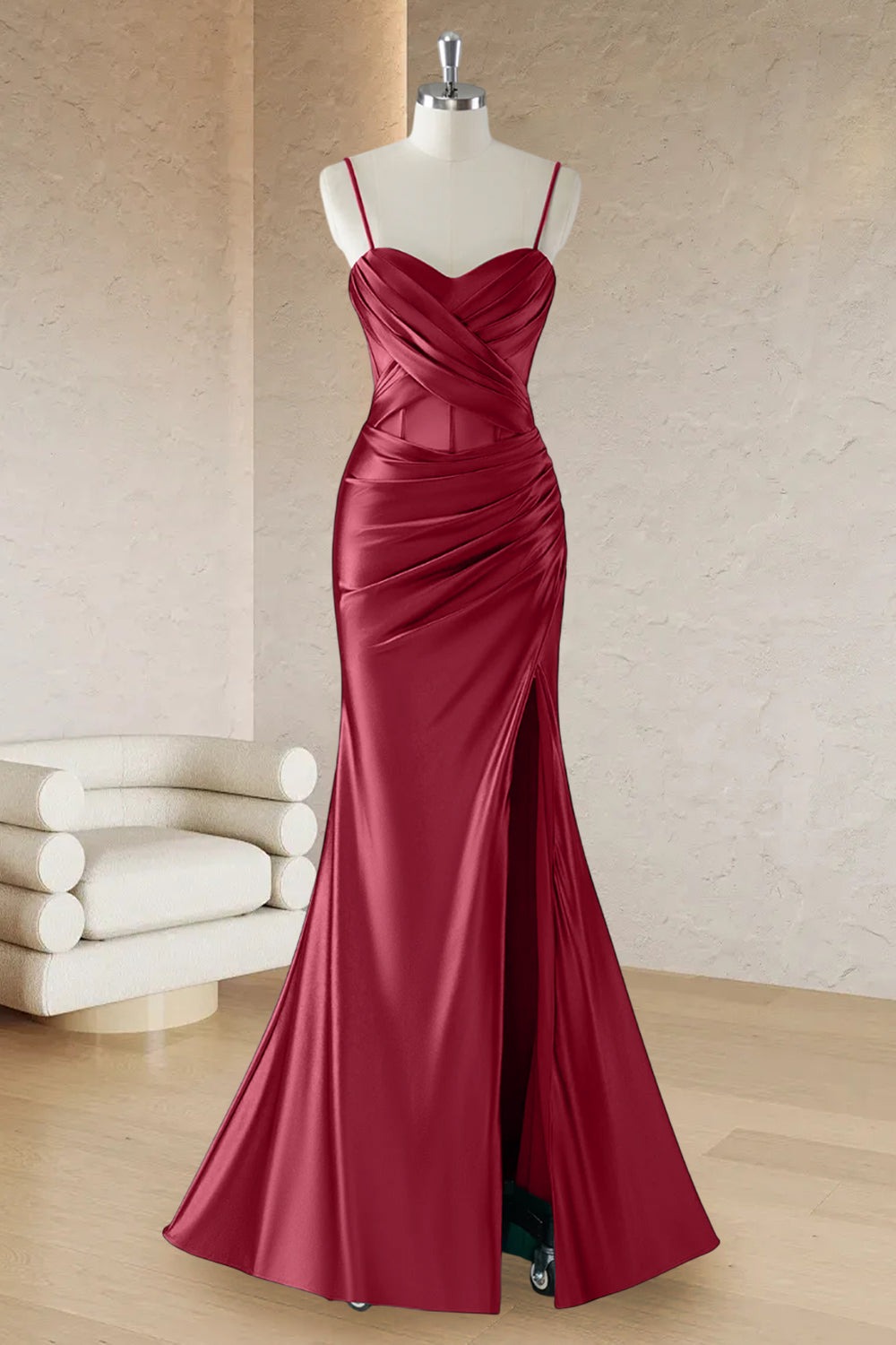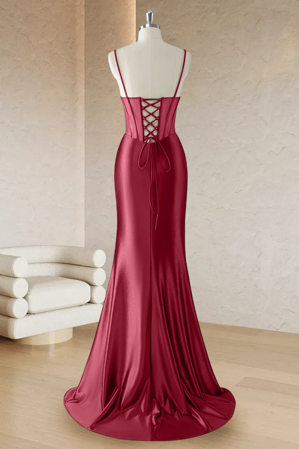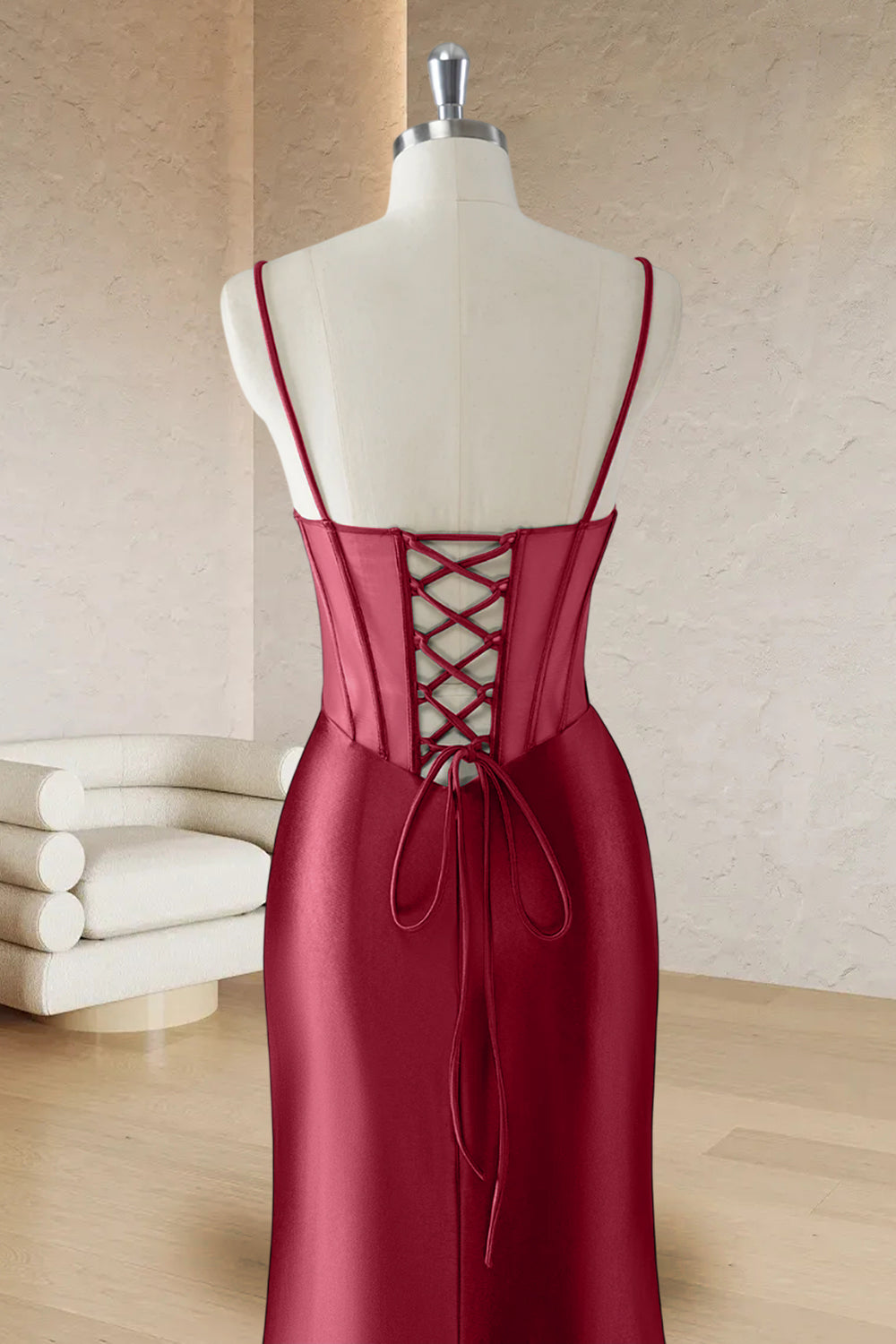 Red Mermaid Spaghetti Straps Corset Long Prom Dress with Slit