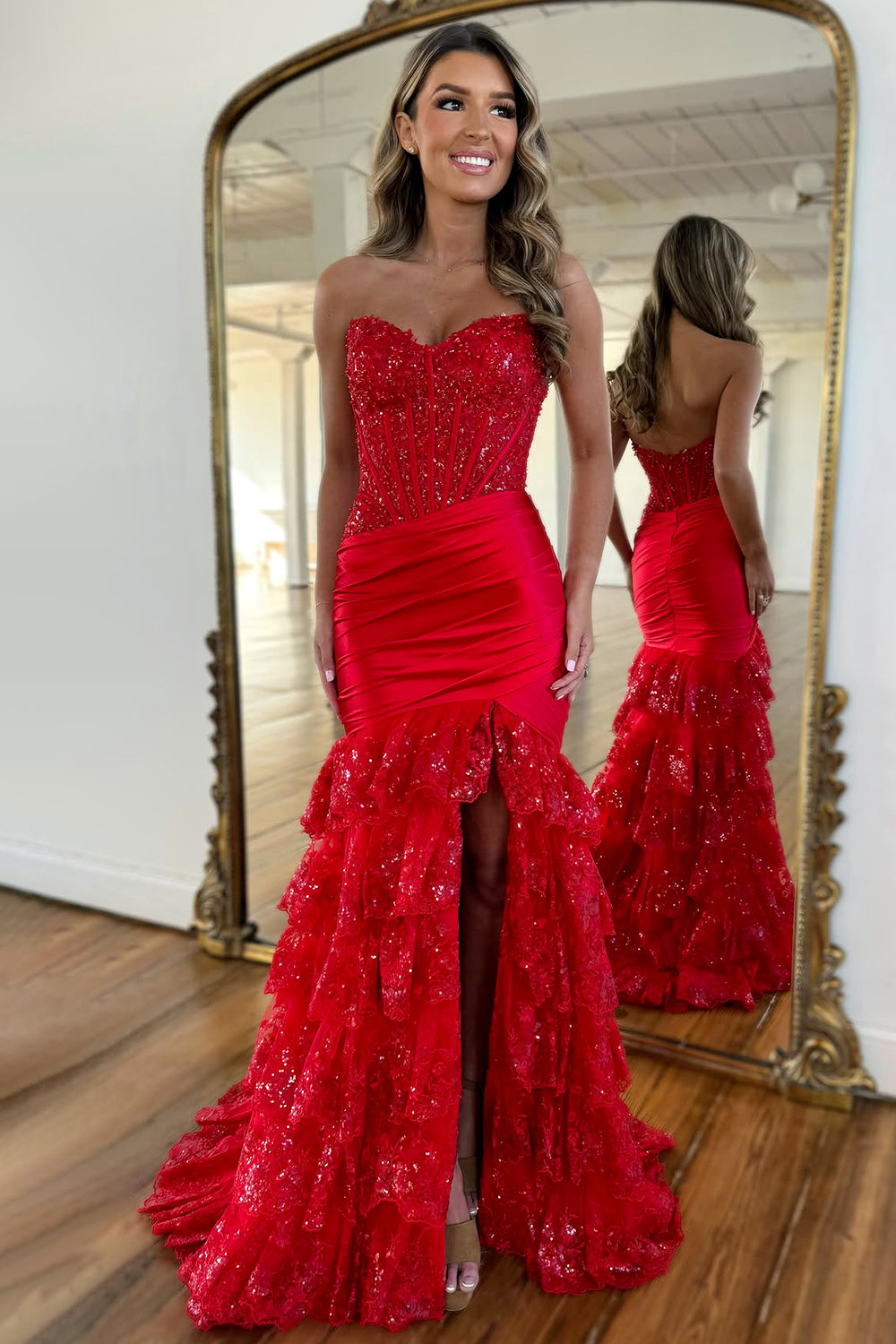 Red Mermaid Strapless Pleated Tiered Long Prom Dress with Slit
