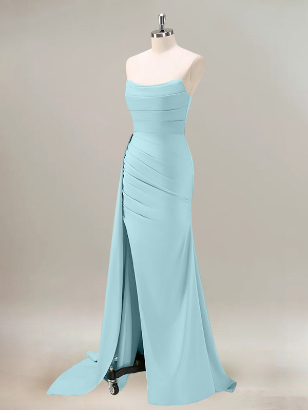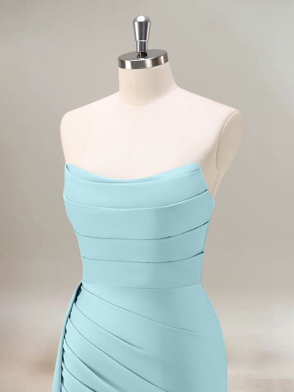 Sky Blue Mermaid Strapless Ruched Long Bridesmaid Dress with Slit