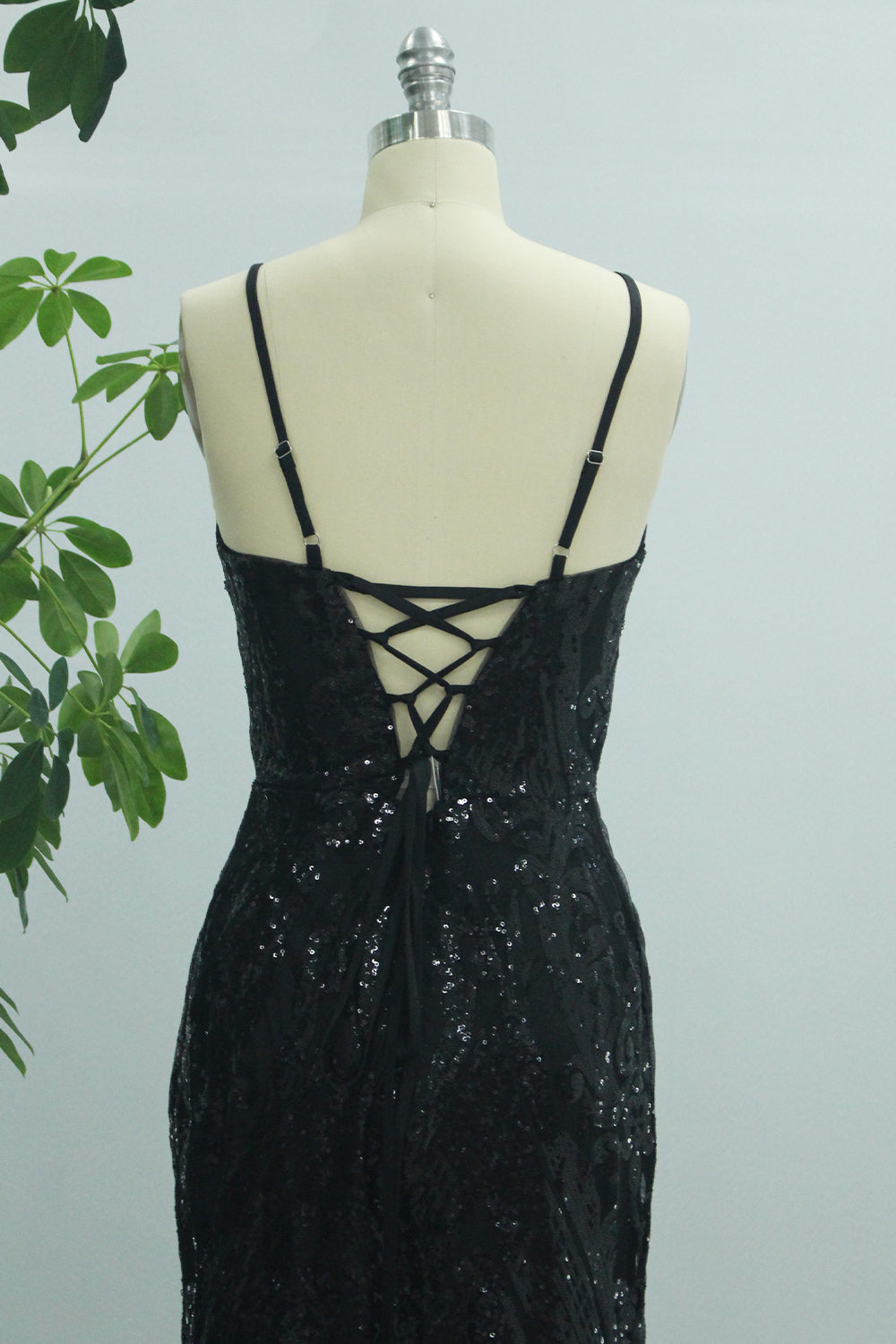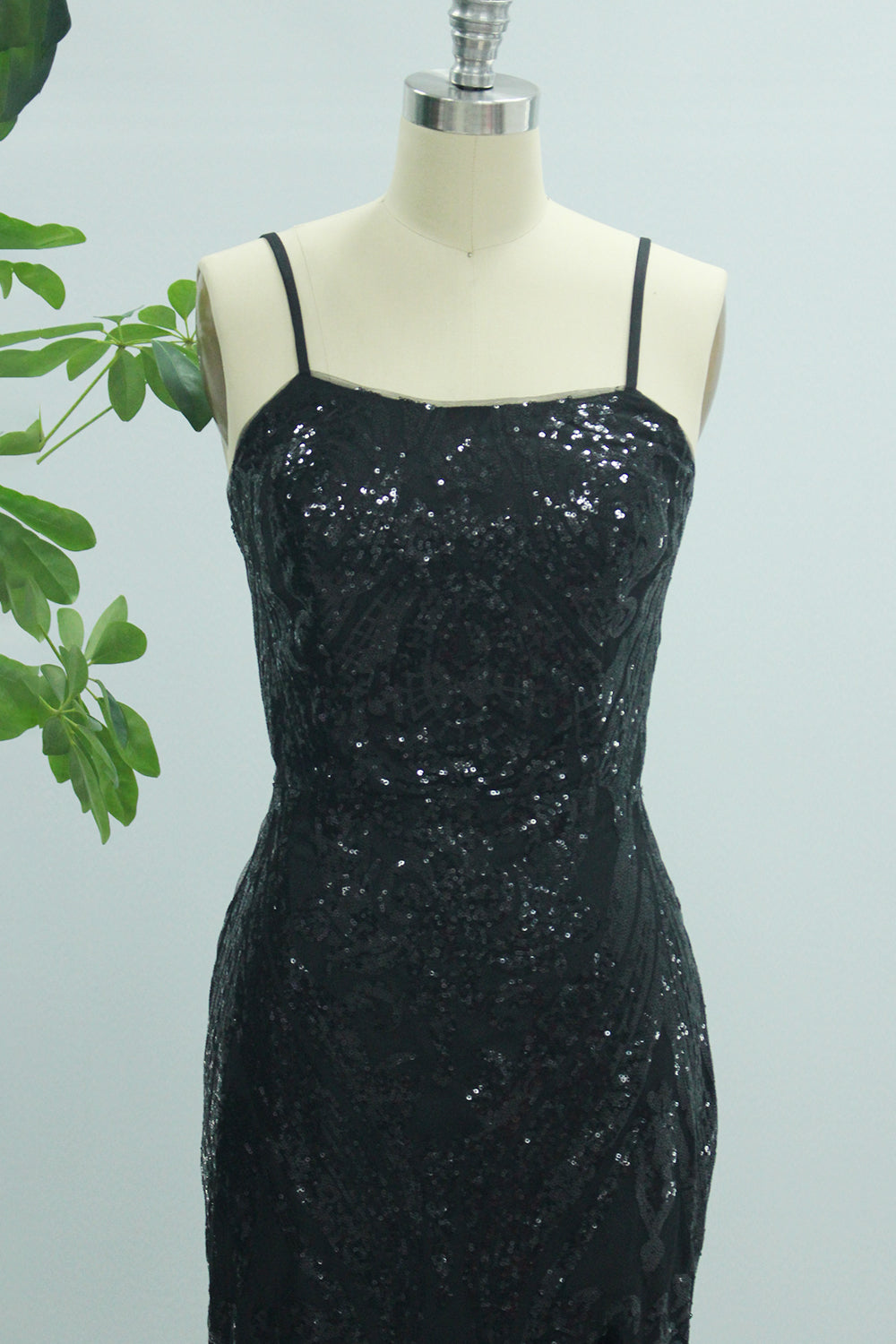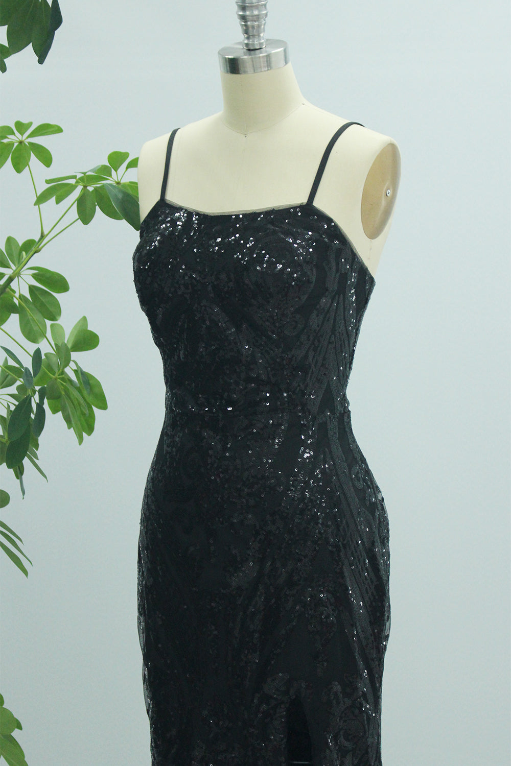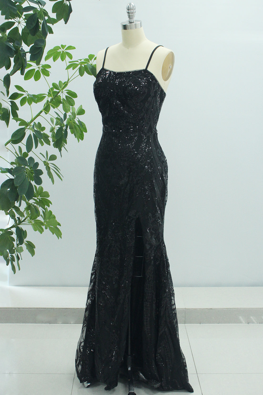 Sparkly Black Mermaid Spaghetti Straps Long Prom Dress with Slit