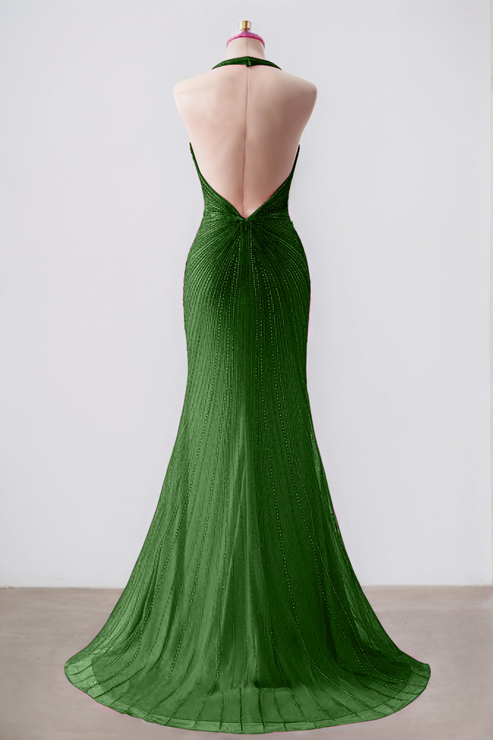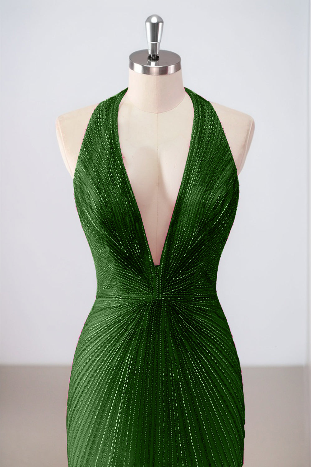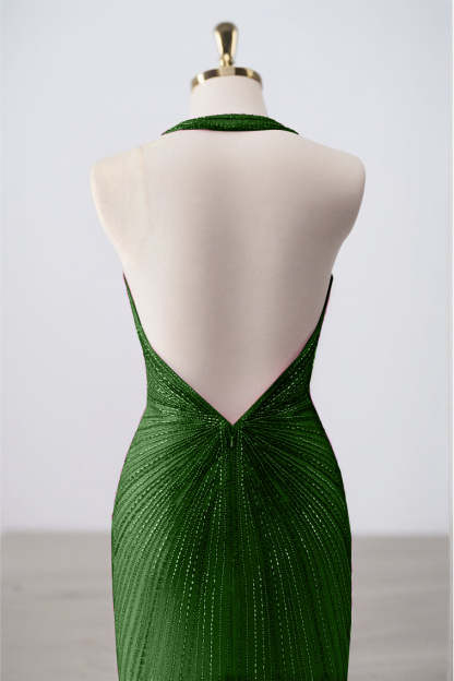 Sparkly Dark Green Mermaid Halter Deep V Neck Long Prom Dress with Slit