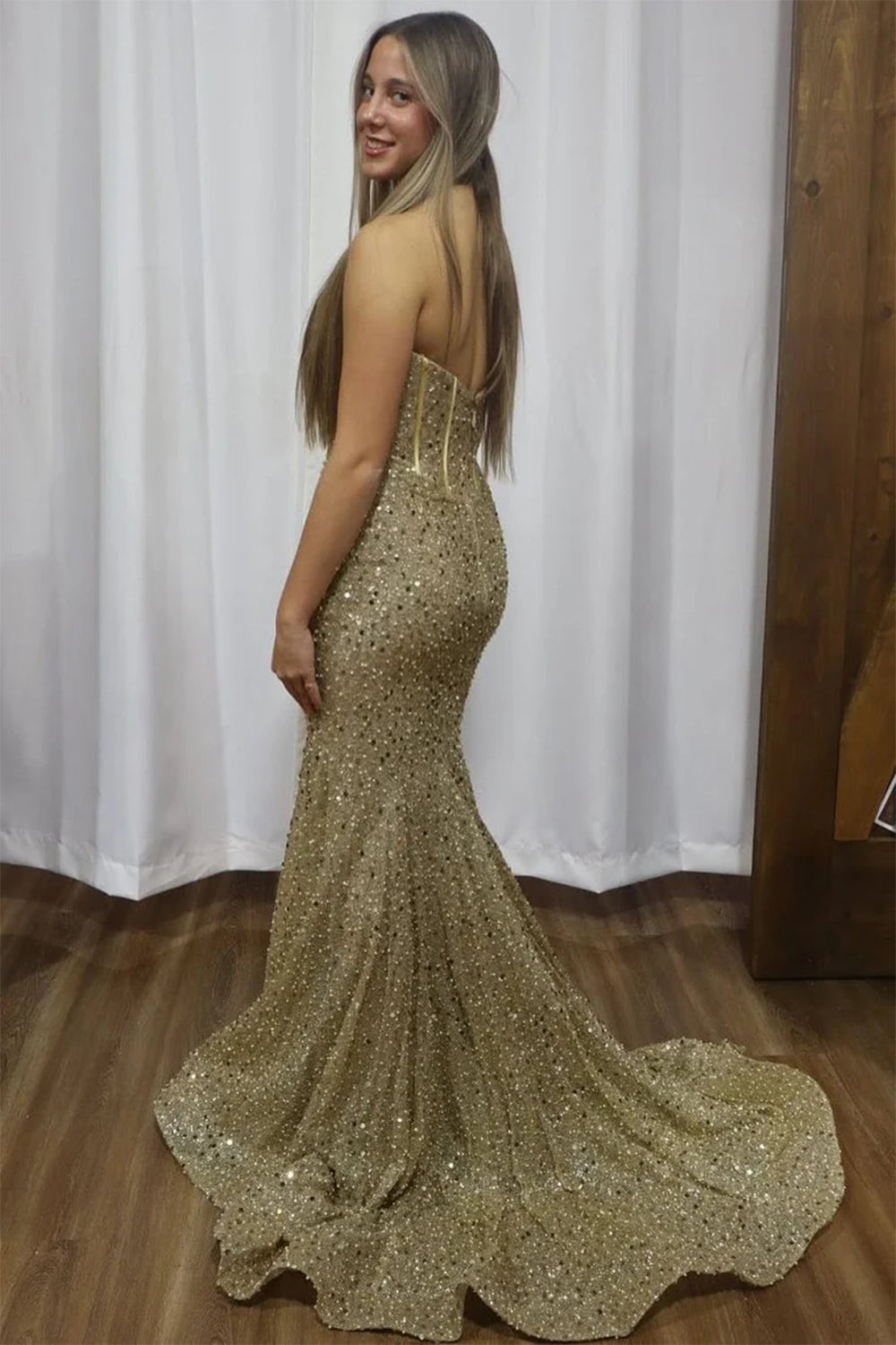 Sparkly Golden Mermaid Strapless Sequined Long Prom Dress