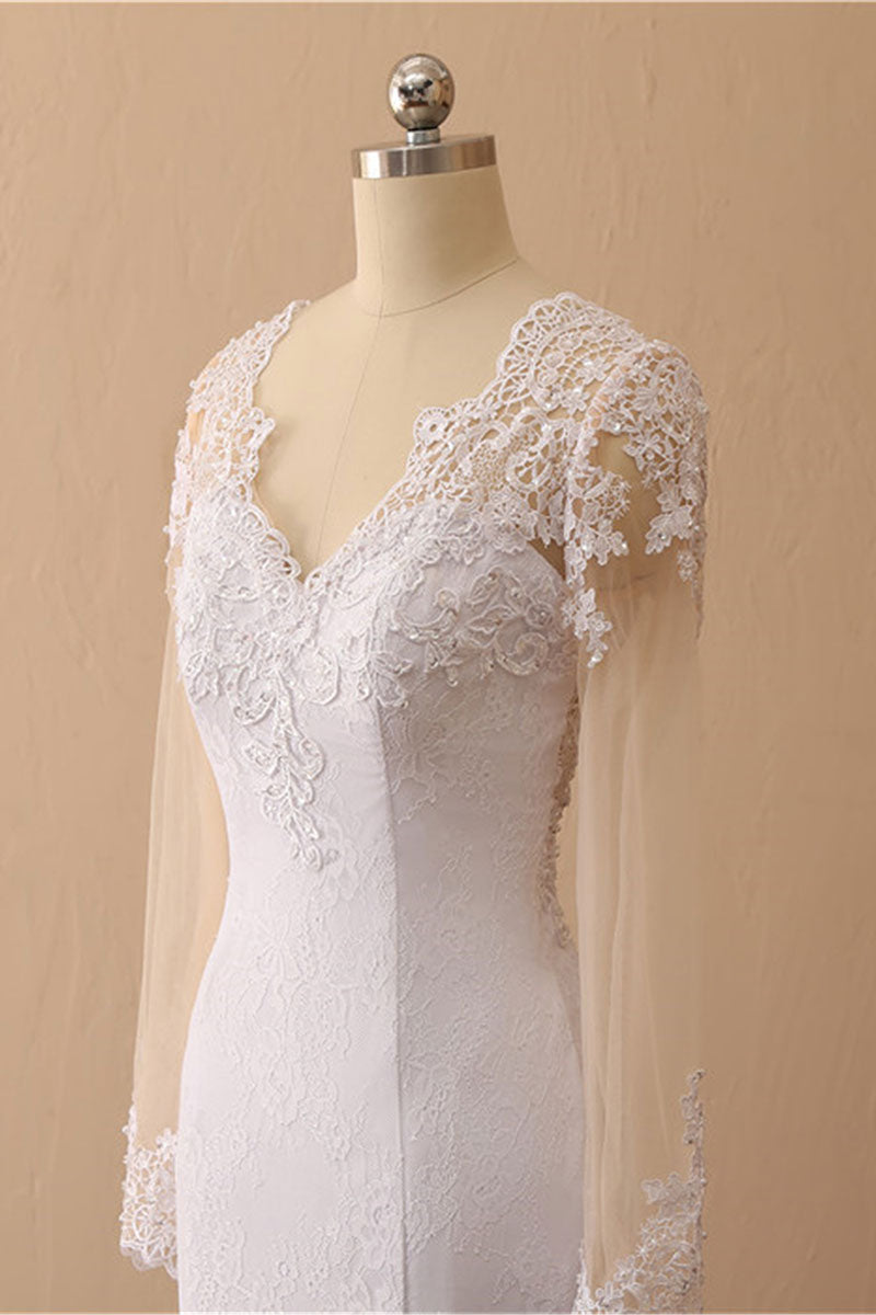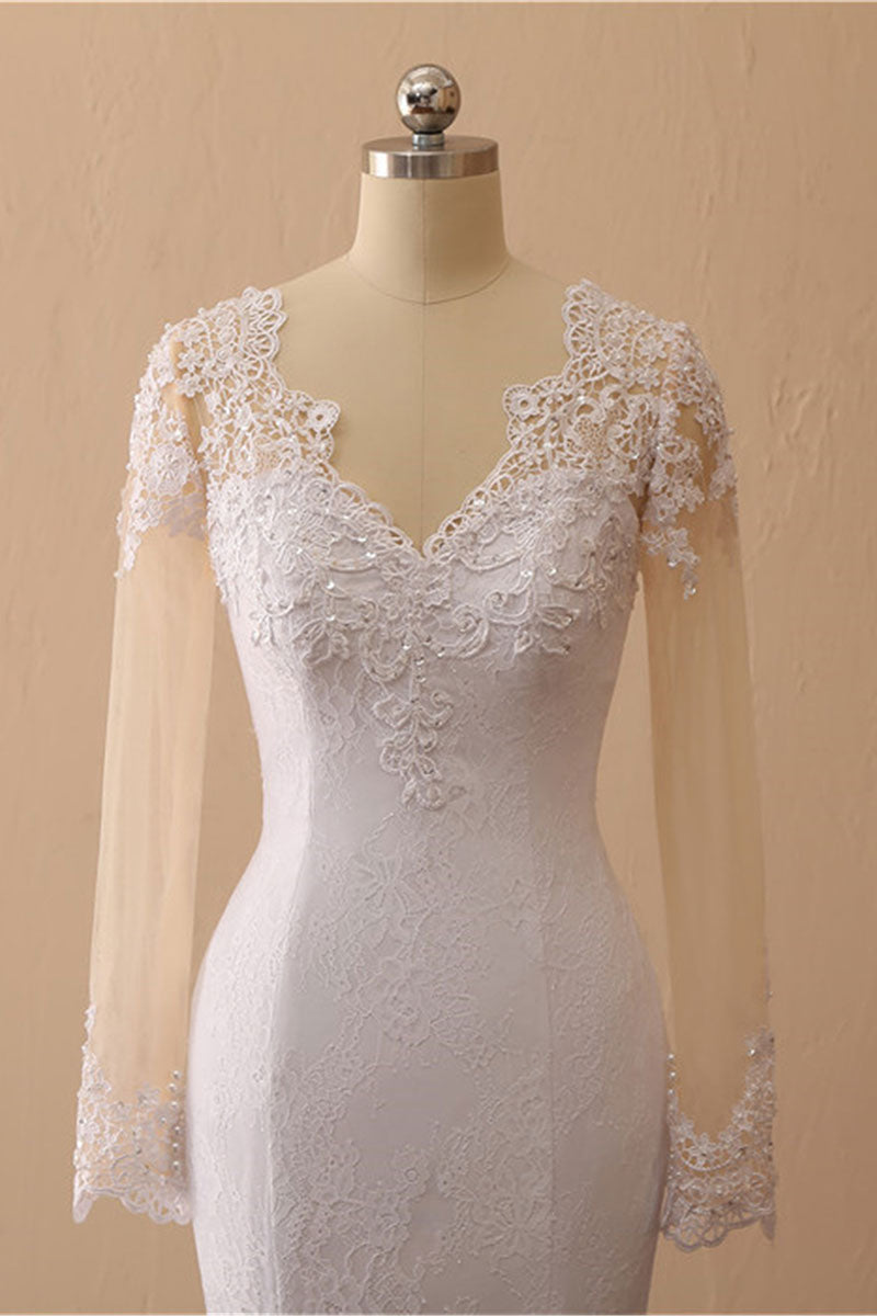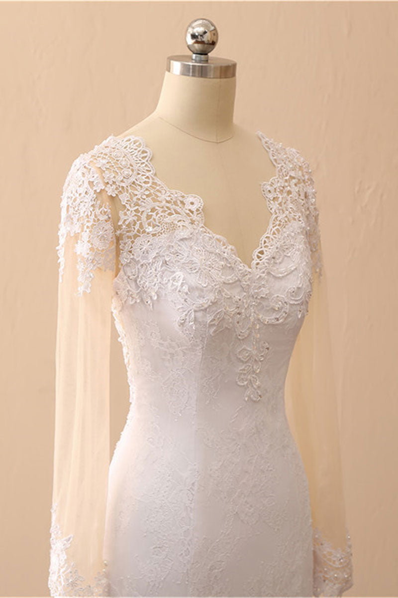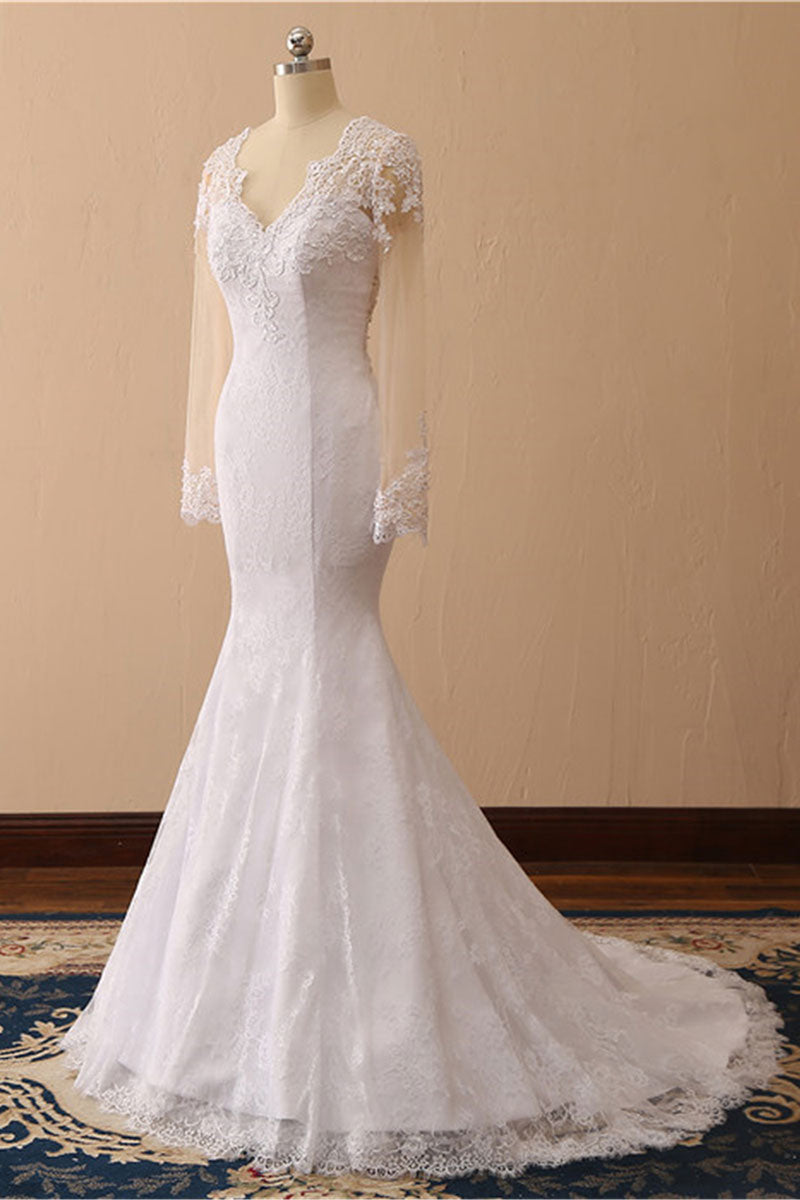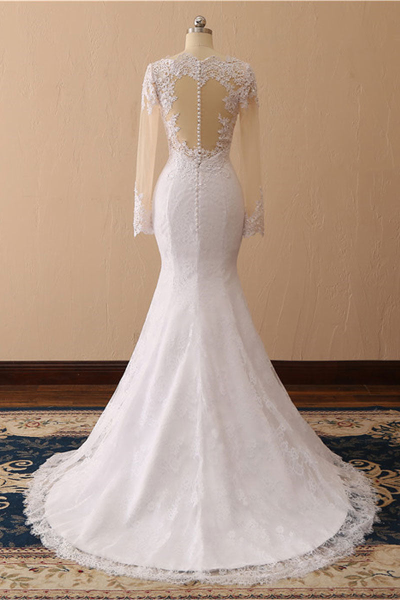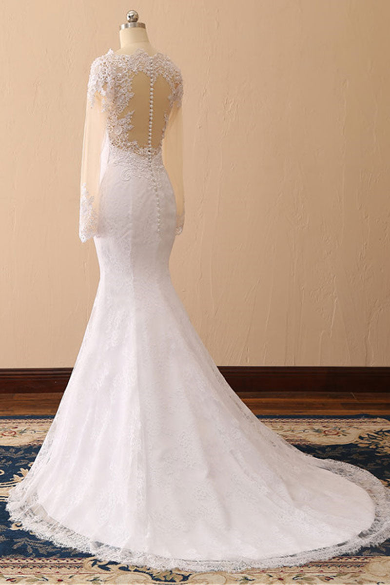 White Mermaid Round Neck Long Bridal Dress With Long Sleeves