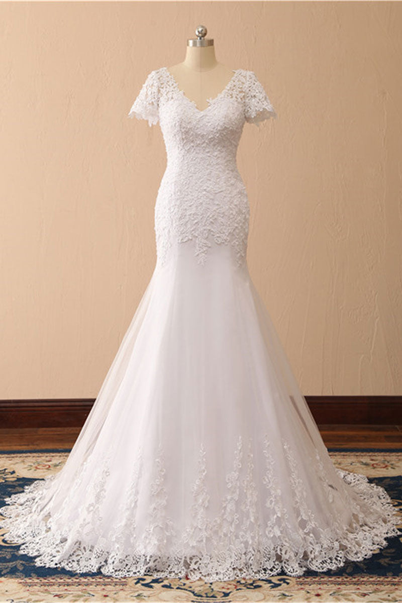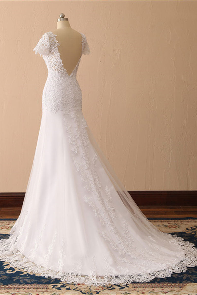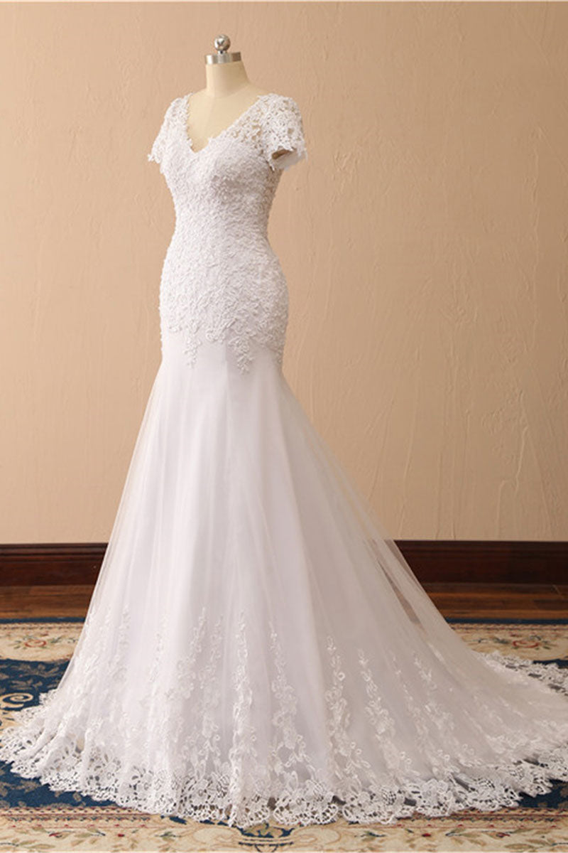 White Mermaid V-Neck Long Bridal Dress With Appliques